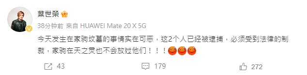 Beyond成員之一的葉世榮在微博發文痛斥毀壞者,稱「今天發生在家駒墳墓的事情實在可惡,這2個人已經被逮捕,必須受到法律的制裁,家駒在天之靈也不會放過他們!!!」