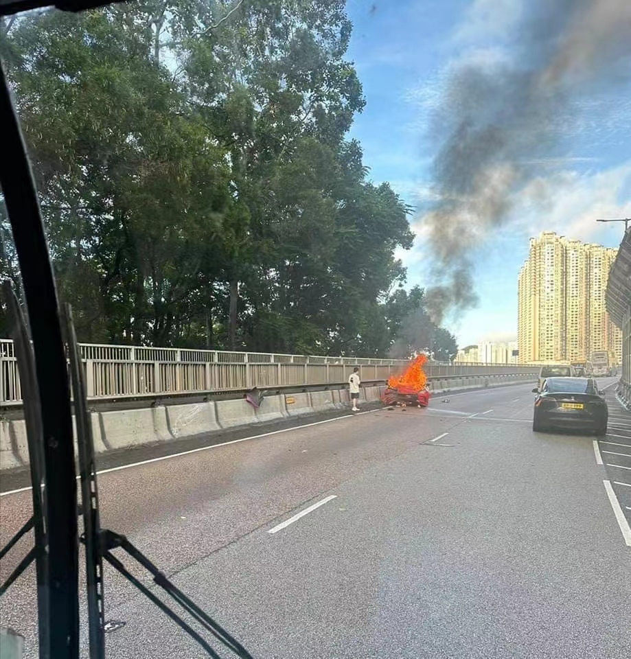 【點新聞報道】青衣有汽車起火。今日(31日)早上7時10分,一輛豐田GR86紅色跑車沿青荃路快線往青衣行駛,其間疑失控撞右邊石壆,繼而反彈打「白鴿轉」,車頭反方向停在左邊慢線。跑車隨即冒煙起火,司機立即逃出報警求助。其後火勢愈燒愈猛,全車瞬間陷入火海。消防員接報出動一條喉及一隊煙帽隊,並用泡沫救火,司機報稱輕傷由救護車送院治理。