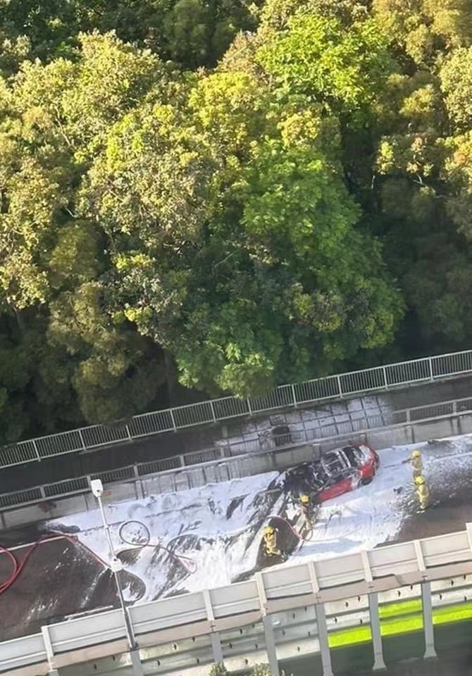 現場可見,涉事跑車車頭嚴重焚毀,車身及車尾箱亦有燒焦痕跡,地上遺下跑車零件及大量泡沬。警方正調查事件起因。