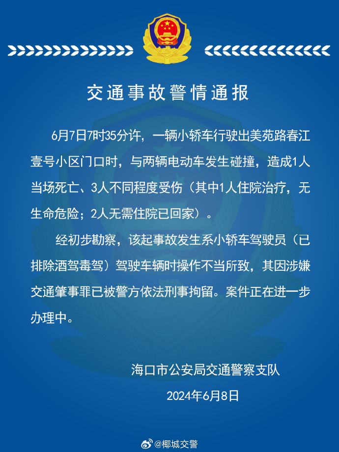 通報指,6月7日7時35分許,一輛小轎車行駛出美苑路春江壹號小區門口時,與兩輛電動車發生碰撞,造成1人當場死亡、3人不同程度受傷(其中1人住院治療,無生命危險,2人無需住院已回家)。經初步勘察,該起事故發生系小轎車駕駛員(已排除酒駕毒駕)駕駛車輛時操作不當所致,其因涉嫌交通肇事罪已被警方依法刑事拘留。案件正在進一步辦理中。