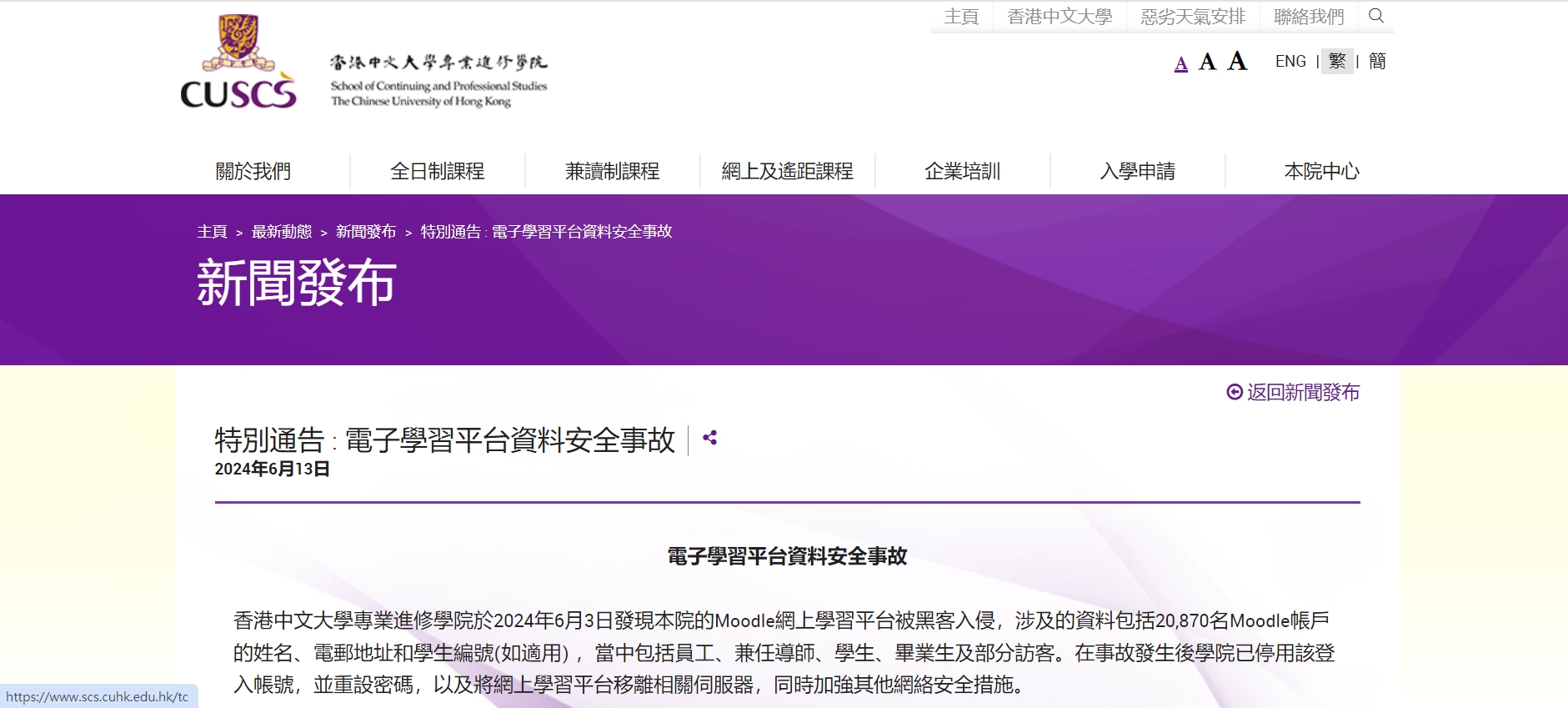 香港中文大學專業進修學院於2024年6月3日發現本院的Moodle網上學習平台被黑客入侵,涉及的資料包括20,870名Moodle帳戶的姓名、電郵地址和學生編號(如適用),當中包括員工、兼任導師、學生、畢業生及部分訪客。在事故發生後學院已停用該登入帳號,並重設密碼,以及將網上學習平台移離相關伺服器,同時加強其他網絡安全措施。