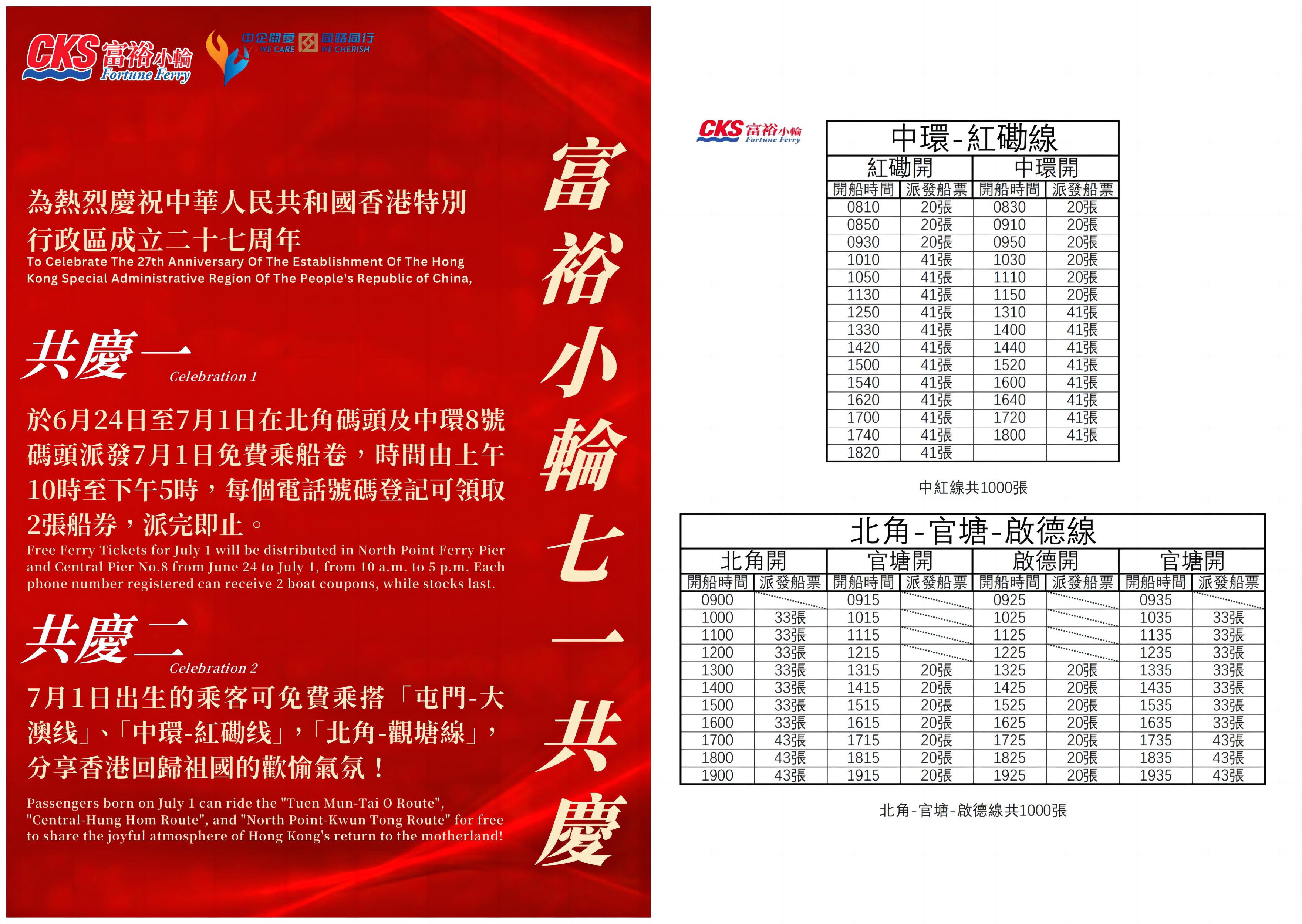 為熱烈慶祝香港回歸祖國27周年,特區政府聯同社會各界將推出一系列特別優惠及活動,涵蓋公共交通、文化藝術消閒、飲食及消費。富裕小輪有限公司宣布在2024年7月1日當日,市民及遊客將可免費搭乘多條渡輪航線,共慶回歸。