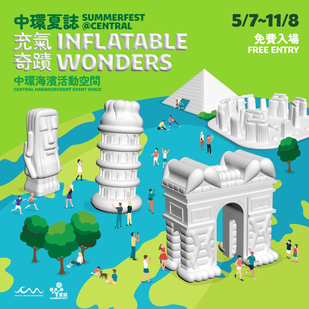 受「充氣奇蹟」設計者、來自亞美尼亞的著名AI藝術家@joooo.ann的作品靈感啟發,《SummerFest@Central 中環夏誌》將設置五大巨型充氣世界奇觀,包括「英國巨石陣」、「智利復活節島摩艾石像」、「埃及吉薩金字塔」、「意大利比薩斜塔」及「法國凱旋門」此裝置以創新的生成式人工智能創作而成,以全白充氣作品呈現眼前。最巨型的裝置高逾13米,晚上更會展現不同光影色彩,日夜各具美態,成為今夏打卡必選。