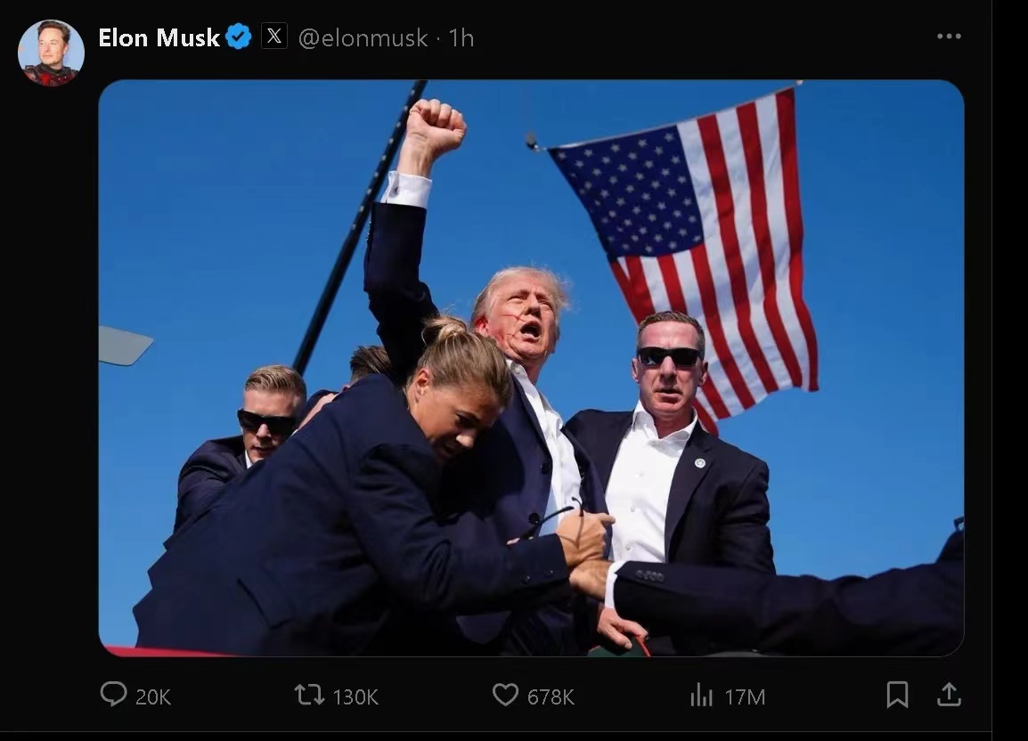 對於馬斯克的第二篇帖文照片,筆者看到特朗普的表演欲和戰鬥力,一個78歲的老人,耳朵中槍、血流滿面,還舉起手,高呼戰鬥。