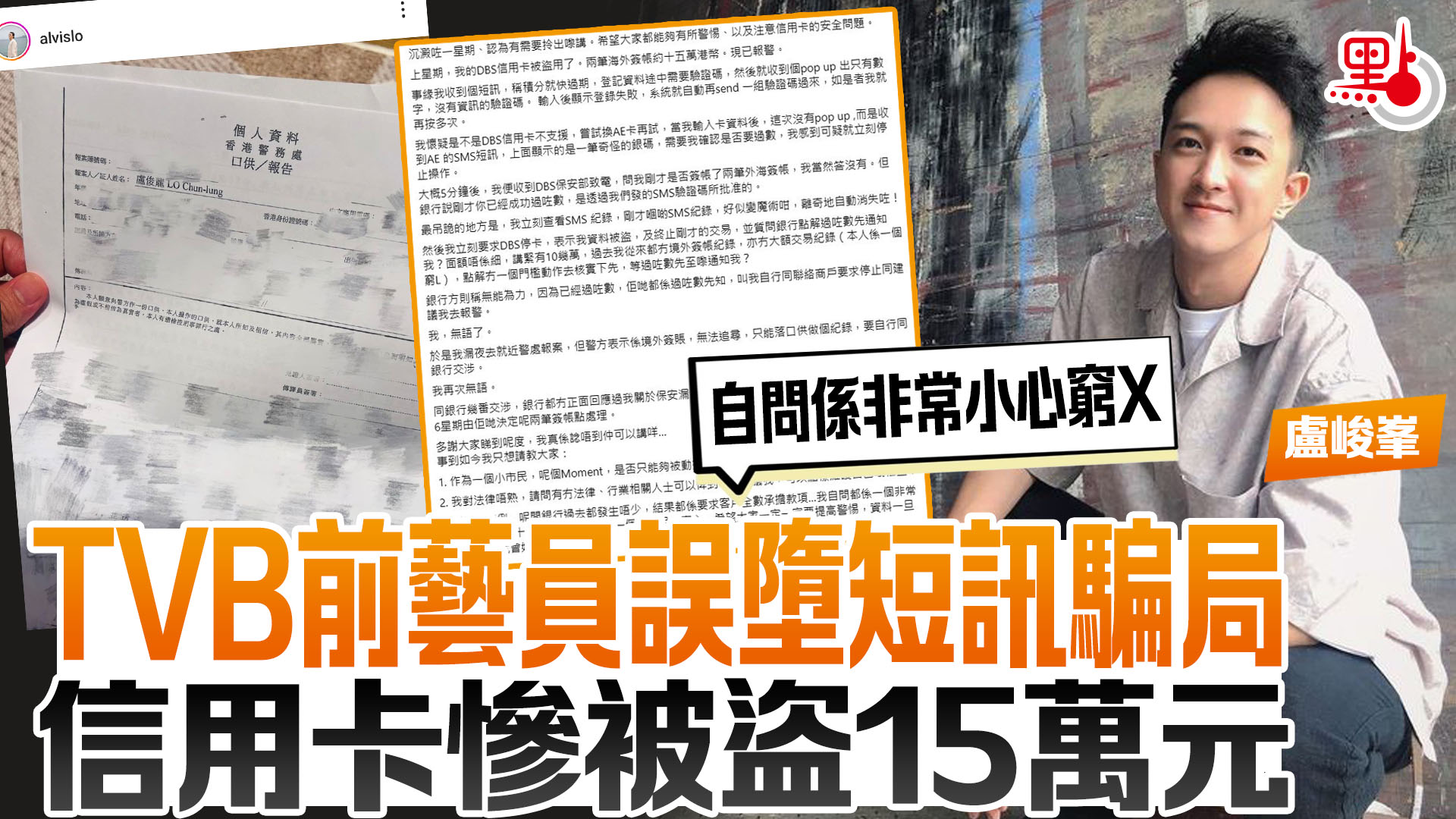 前TVB藝員盧峻峯(Alvis)昨日在IG自爆誤墮短訊騙局,信用卡慘被盜用15萬港幣,損失慘重,特別分享這次的經歷,希望大家都能有所警剔,以及注意信用卡的安全問題。