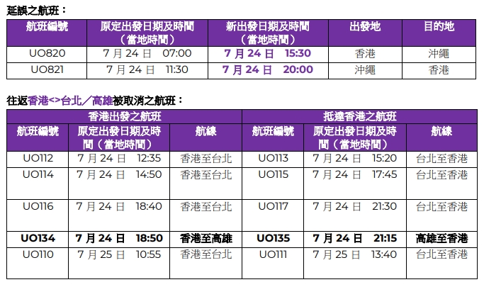 香港快運表示,延誤之航班包括「香港往返沖繩」;取消之航班則包括「香港往返台北及高雄」。今日再新增兩班航班被取消,包括(UO134——香港至高雄)及(UO135——高雄至香港)。香港快運續指,由於天氣狀況不穩定,其他航班或會出現更改。