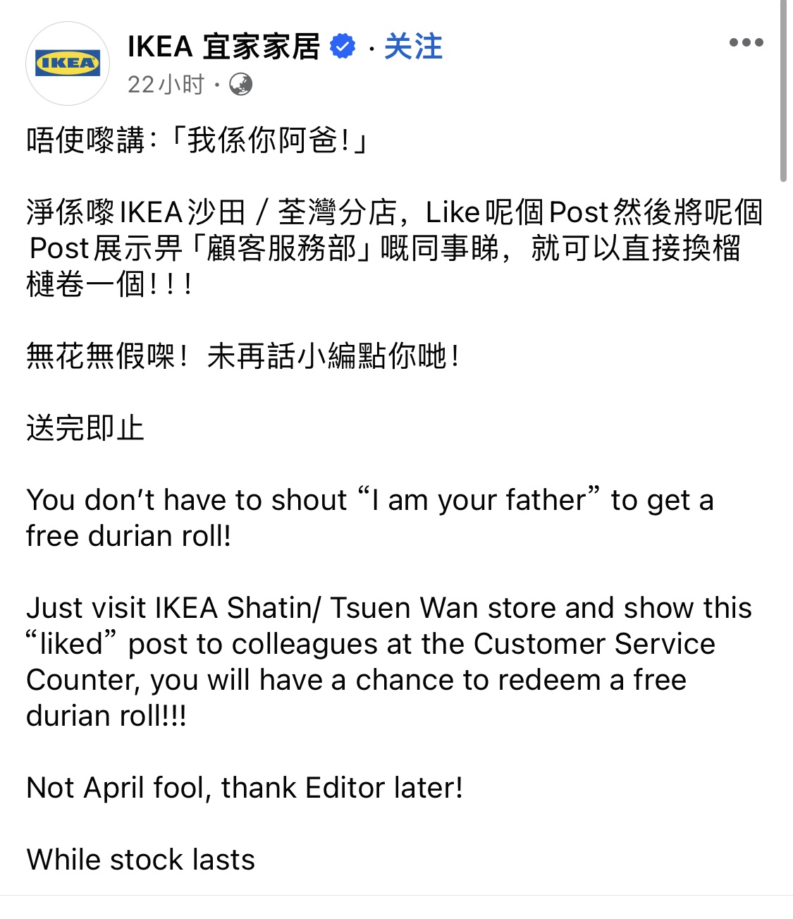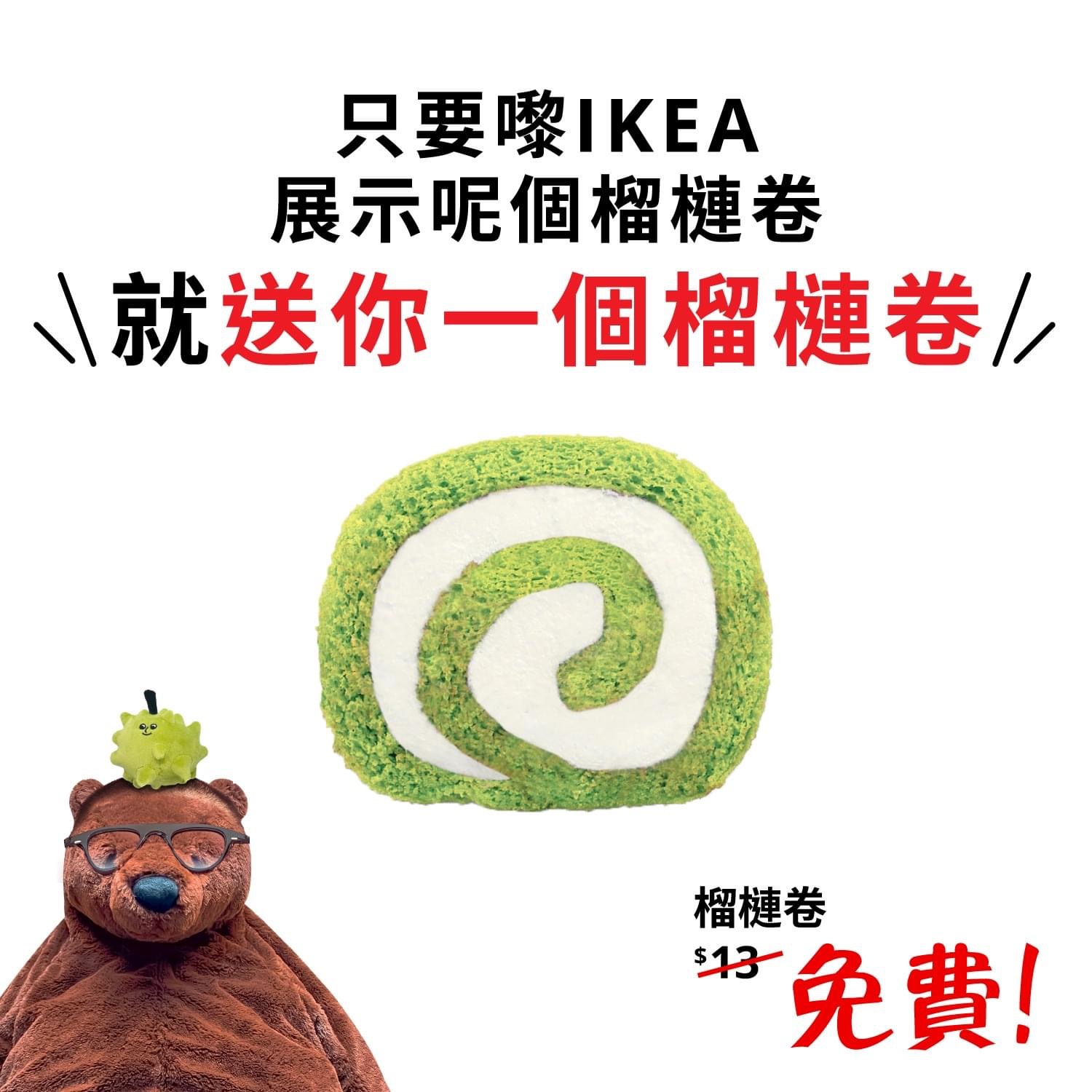 IKEA之前曾推出一系列榴槤甜品,反應良好,由榴槤雪糕至榴槤芝士蛋糕應有盡有。昨日(23日)IKEA於FACEBOOK主頁上分享,只要讚好以下官方貼文,並在指定兩間分店,包括荃灣及沙田店展示給「顧客服務部」,即可免費獲得榴槤斑蘭卷一個!