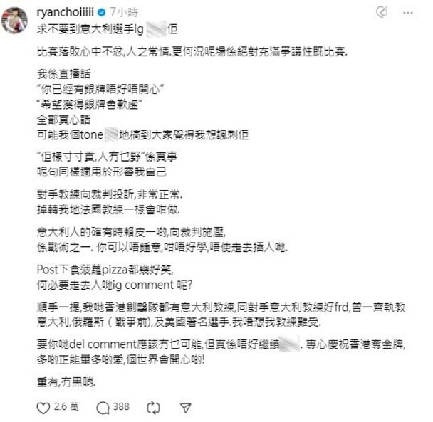 張家朗成功衛冕奧運金牌,港將兼張家朗隊友蔡俊彥則於社交網發文,叫網民不要到意大利選手的社交平台批評他,直言:「比賽落敗心中不忿,人之常情。」又言自己在直播中對意大利選手説:「你已經有銀牌唔好唔開心,希望獲得銀牌會謙虛」,並無諷刺的意思,笑稱自己是「樣寸寸貢,人冇乜嘢」。