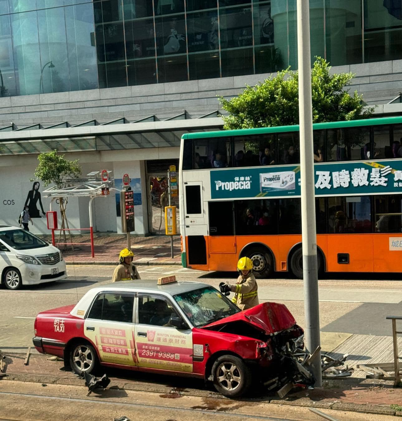 警方及消防接報指有人被困事故的士車上,立刻趕到現場拯救,其間消防員協助司機及乘客打開車門落車,2人均告受傷,需由救護車治理送院。