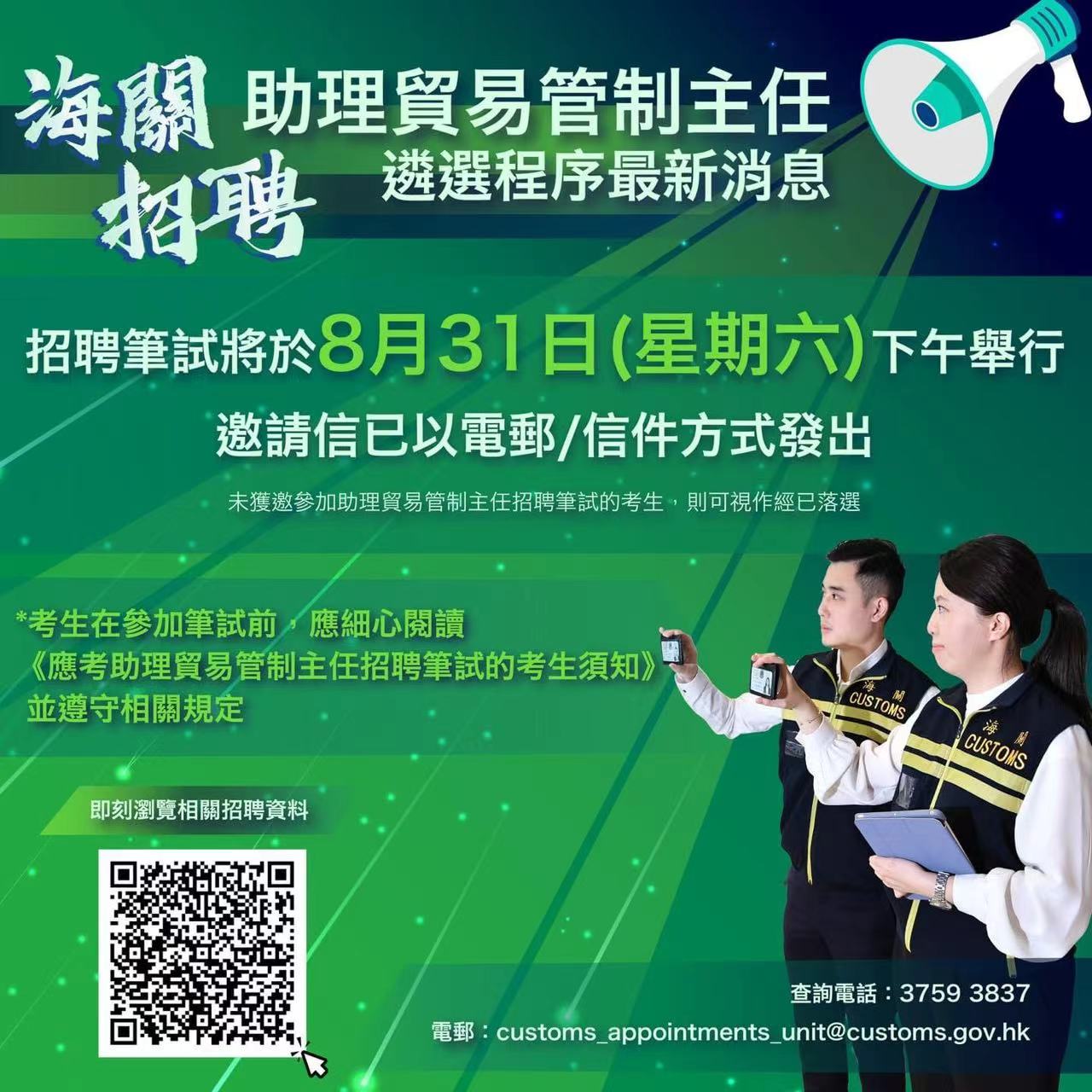 海關指出,邀請信已以電郵或信件的形式發予獲邀參加筆試的考生;而未收到邀請信的考生,則可視作經已落選。另外,是次考試只在8月31日舉行。考生必須根據邀請電郵或信上訂明的時間及試場準時抵達指定的試場應考。任何更改考試時間或試場的要求將不會被接納。