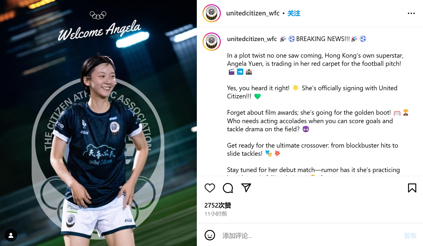 【點新聞報道】香港女子甲組聯賽球隊公民宣布簽入藝人袁澧林(Angela)。公民女足透過IG宣布,曾贏得金馬獎及金像獎提名的袁澧林正式加盟球隊,並寫道:「沒人料到劇情會如此轉折,袁澧林從紅地毯走上足球場⋯⋯是的,她正式加盟公民女足。」並着粉絲「期待她的地標戰吧,有傳她有練習如何戲劇性地跌倒」。據悉袁澧林有正式參加訓練,但需註冊後方可在比賽上陣。
