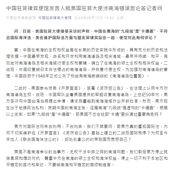 【點新聞報道】日前,美國駐菲大使接受採訪時聲稱,中國在南海的「九段線」是「卡通畫」,不符合國際海洋法,美在維護國際法方面與盟友菲律賓站在一起。中國駐菲律賓大使館回應表示,中國在南海的主權和權益是在長期的歷史實踐中形成的,具有充分的歷史和法理依據。