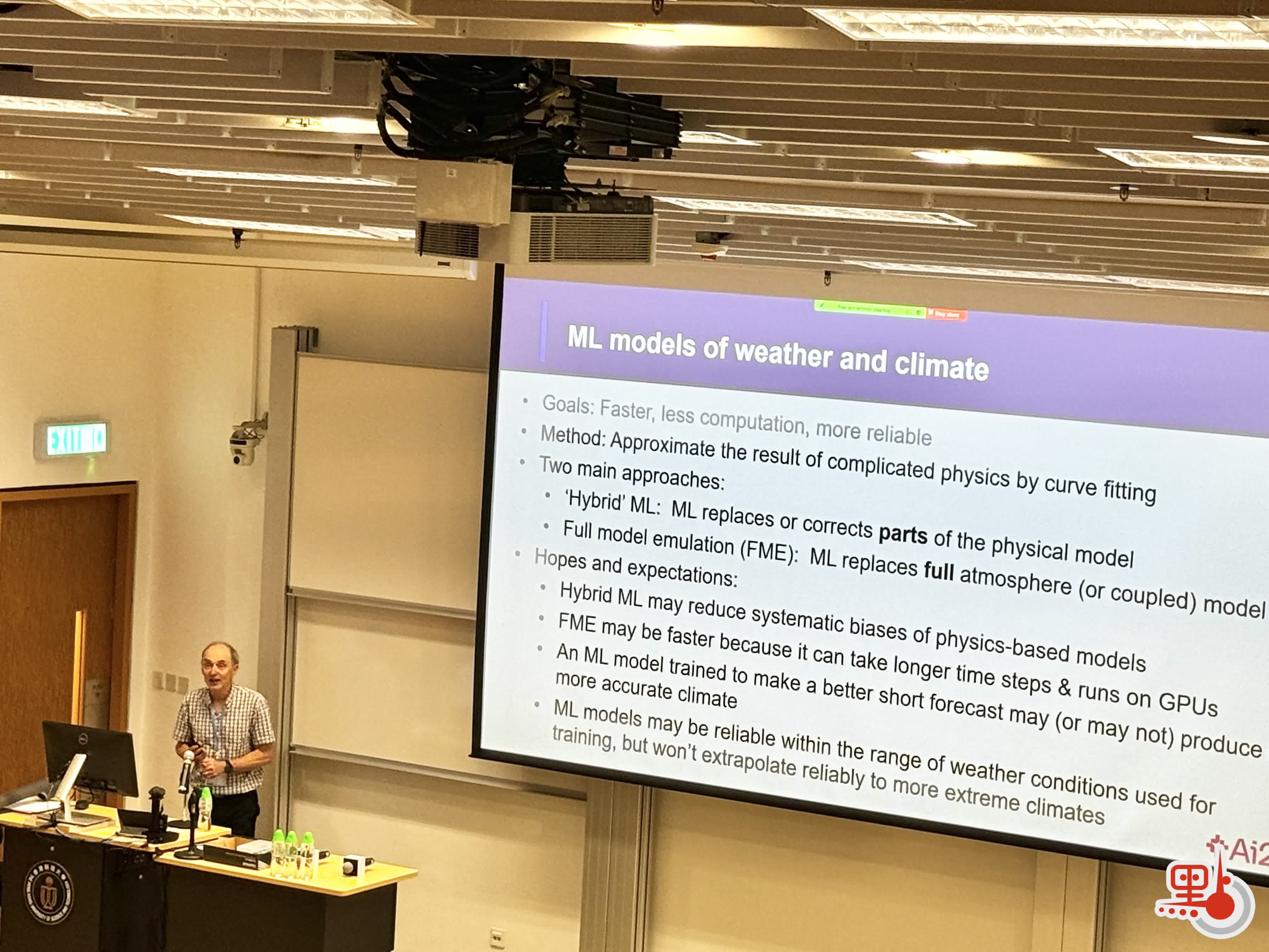 艾倫人工智能研究所的大氣科學家克里斯托弗·布雷瑟頓(Christopher Bretherton)在會上分享了他使用人工智能進行氣候建模的經驗。他指出,氣候變化、二氧化碳排放和全球變暖是當前面臨的重大挑戰。此外,多位講者強調了氣候變化對天氣的影響,包括更強烈的洪水和乾旱,以及這些變化如何加劇天氣的不可預測性。