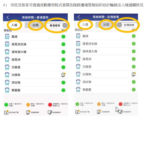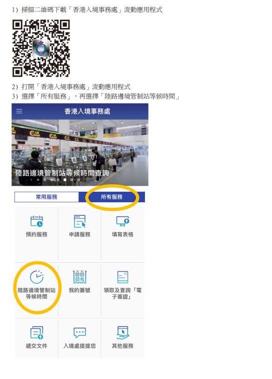 此外,市民及旅客亦可下載入境處流動應用程式隨時隨地查閱各陸路邊境管制站的估計輪候過關狀況,以便計劃行程及減省排隊時間。