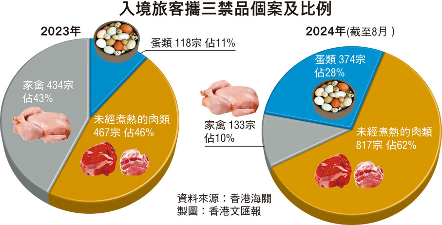 今年首8個月查獲的非法進口受規管食物案件中,未經煮熟肉類最多,佔817宗(62%);其次為蛋類,佔374宗(28%);家禽則佔133宗(10%)。
