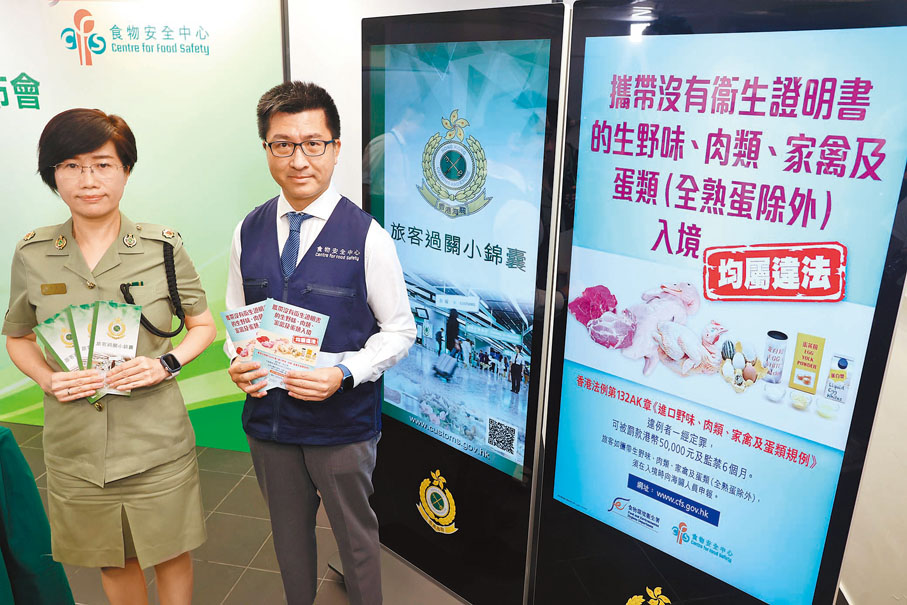 香港海關和食安中心發現,經陸路口岸非法進口受規管食物的個案有上升趨勢,今年首8個月已錄得1,324宗,較去年同期上升一倍;亦超過去年全年的1,019宗,當中以香港居民攜帶未經煮熟肉類佔最多,大部分人因不熟悉法例,或被誤導以為將生肉真空包裝、錫紙包裝或汆水(滾水將表面燙熟),便不會觸犯法例。食安中心提醒市民,食物缺乏適當包裝儲存容易滋生微生物,對食物安全及公眾衞生構成負面影響。國慶黃金周將至,海關將在各口岸加強跨部門執法及宣傳。