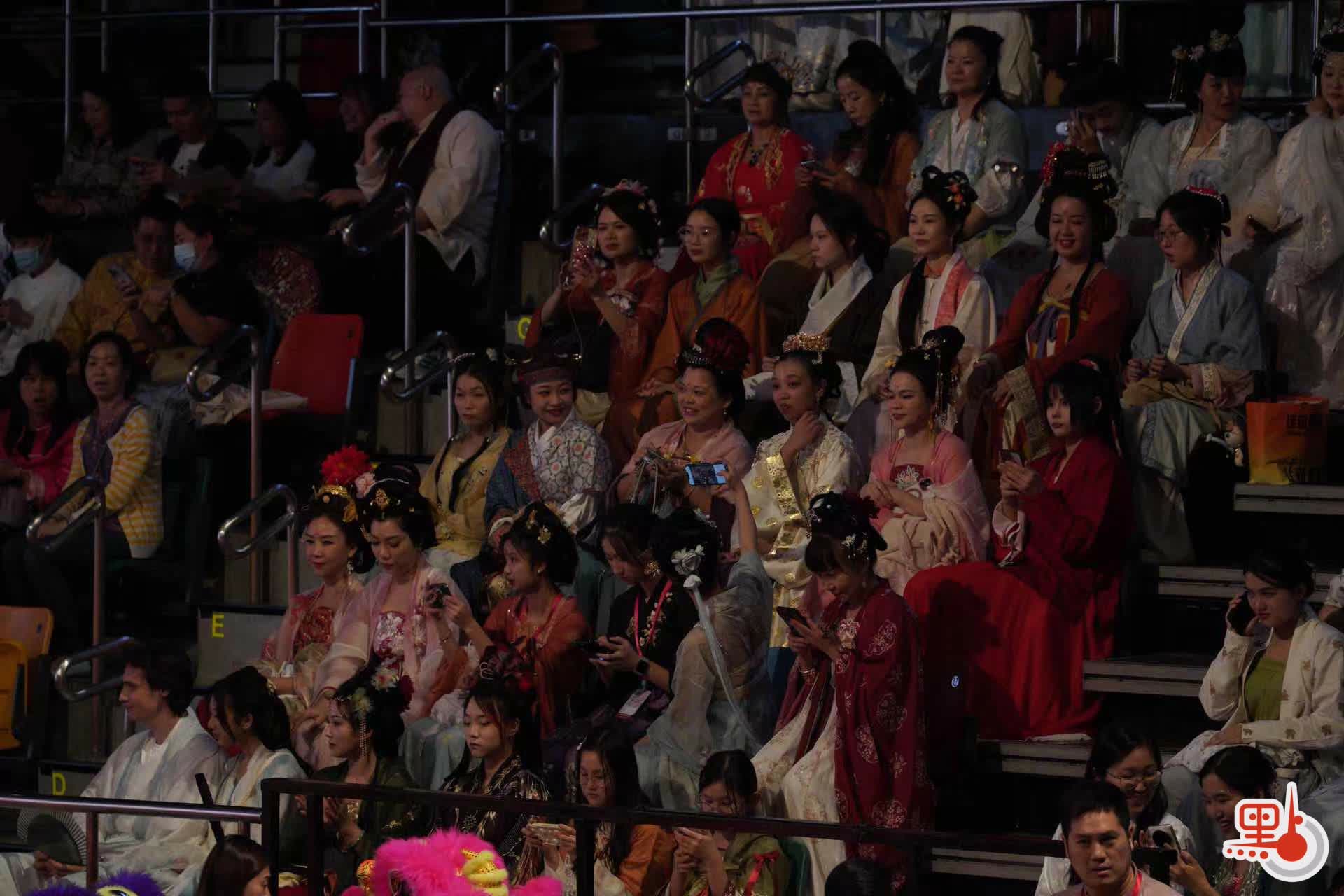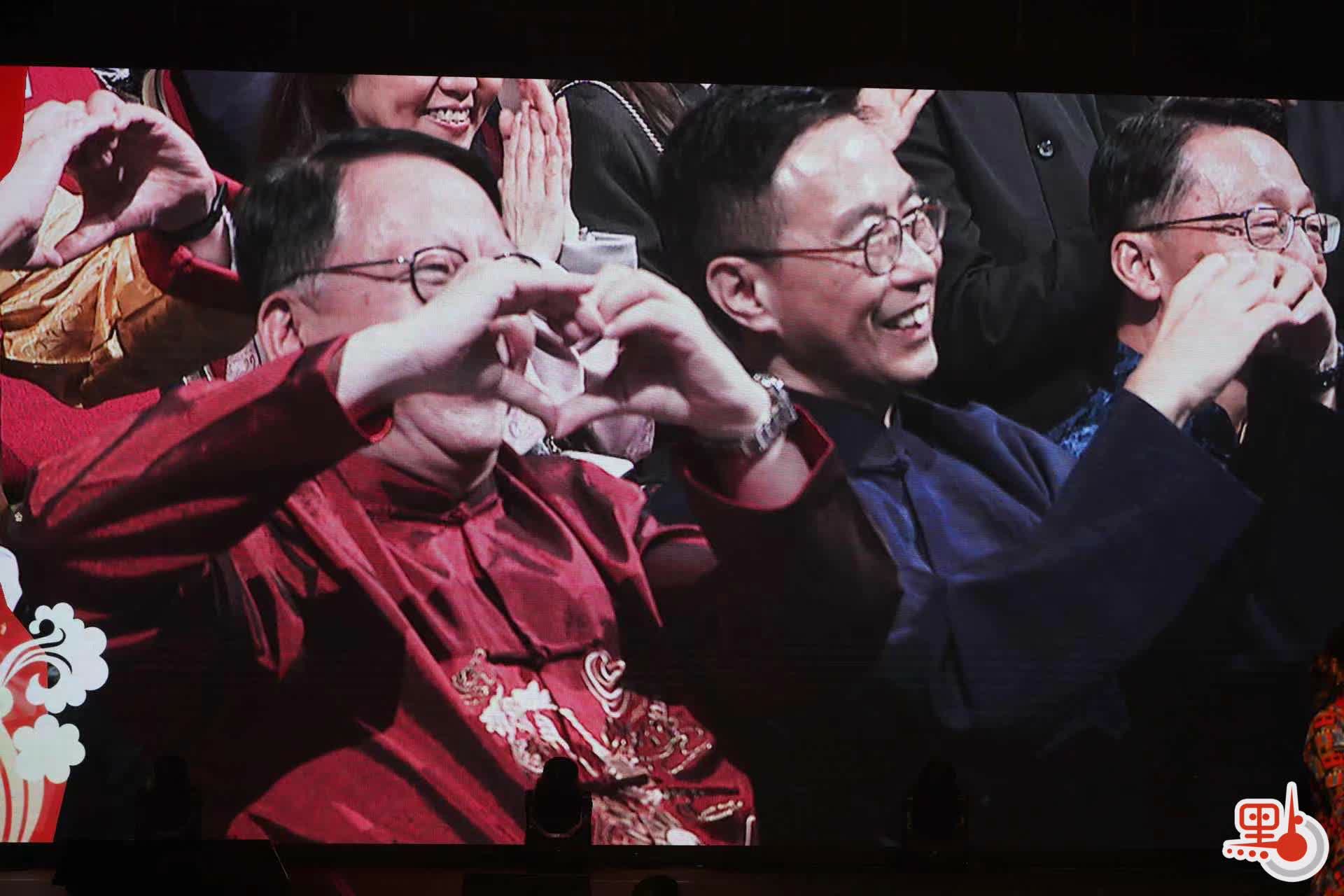 中場休息時,現場攝影機捕捉到嘉賓席和觀眾席上的溫馨畫面,包括政務司司長陳國基、文化體育及旅遊局局長楊潤雄等一眾嘉賓對着鏡頭比心,共同見證這一文化交流的重要時刻。