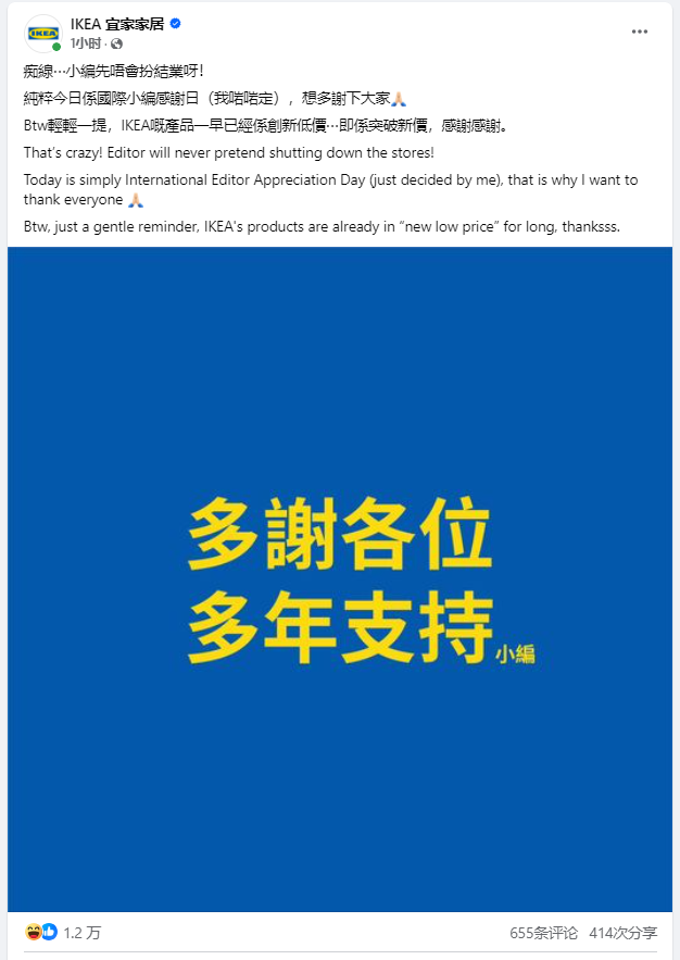 連鎖家品店IKEA的小編亦在中午即出post「抽水」。IKEA在社交平台同樣發帖「多謝各位多年支持」,並加上字體較小「小編」兩字。帖文開頭更直接暗諷:「痴線⋯小編先唔會扮結業呀!」其後更疑似直線「炮轟」實惠:「IKEA嘅產品一早已經係創新低價⋯即係突破新價」。