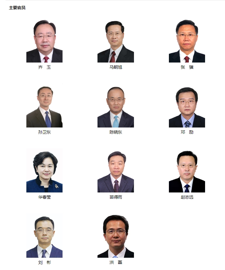 外交部官網「主要官員」顯示,外交部部長為王毅,外交部黨委書記為齊玉。外交部副部長分別是馬朝旭、孫衛東、陳曉東、鄧勵、華春瑩。馬朝旭為分管外交日常業務工作的副部長(正部長級)。張驥為外交部黨委委員、中央紀委國家監委駐外交部紀檢監察組組長。外交部現有四位部長助理,分別是苗得雨、趙志遠、劉彬、洪磊。