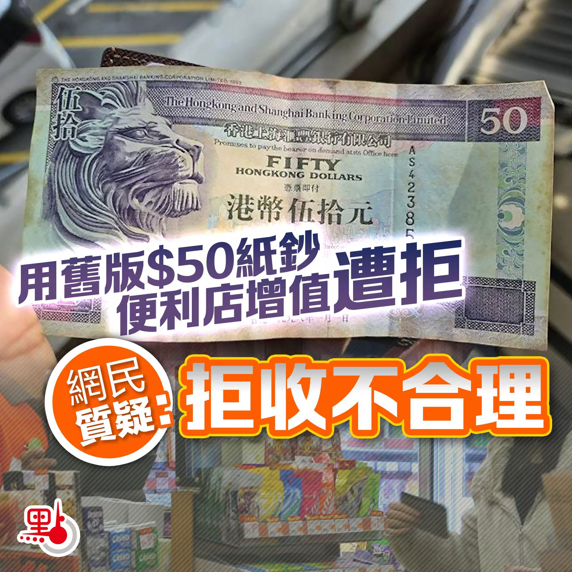 用舊版$50紙鈔便利店增值遭拒 網民質疑:拒收不合理