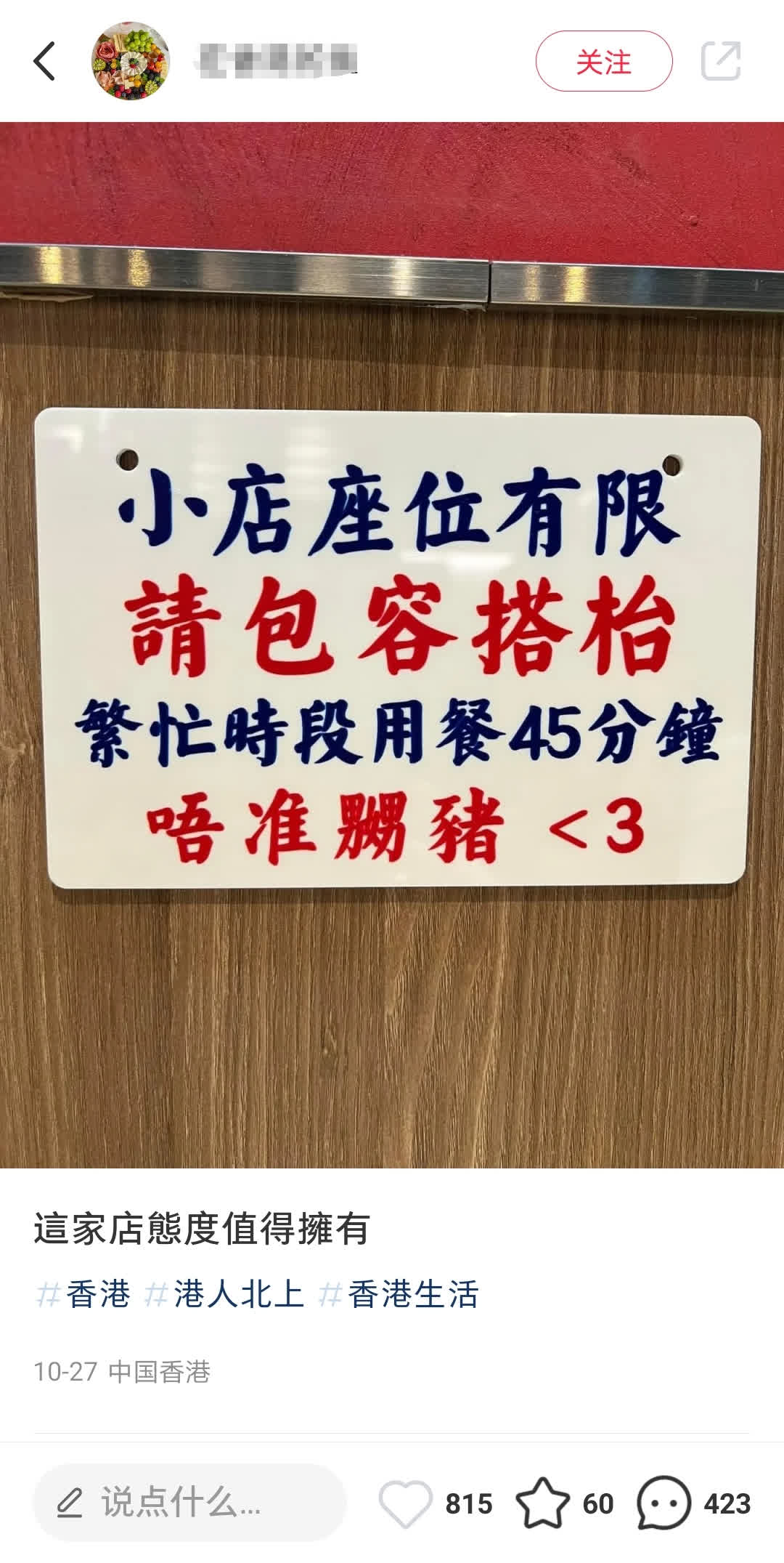 近日,有香港市民發文為一家茶餐廳的服務態度點讚,圖上的標語引發了網友熱議。