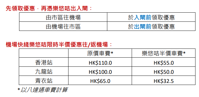 樂悠咭持有人只需於出入閘前,前往機場快綫客務中心(博覽館站除外)出示樂悠咭,即可領取八達通車費半價優惠,再憑咭以優惠價乘搭機場快綫由香港站、九龍站或青衣站往返機場。另外,享用此優惠的樂悠咭持有人,仍可享機場快綫免費港鐵接駁服務,由任何港鐵站往返香港站、九龍站或青衣站的港鐵接駁車程均免費。