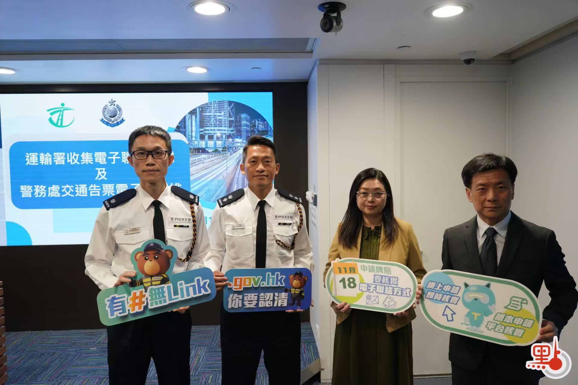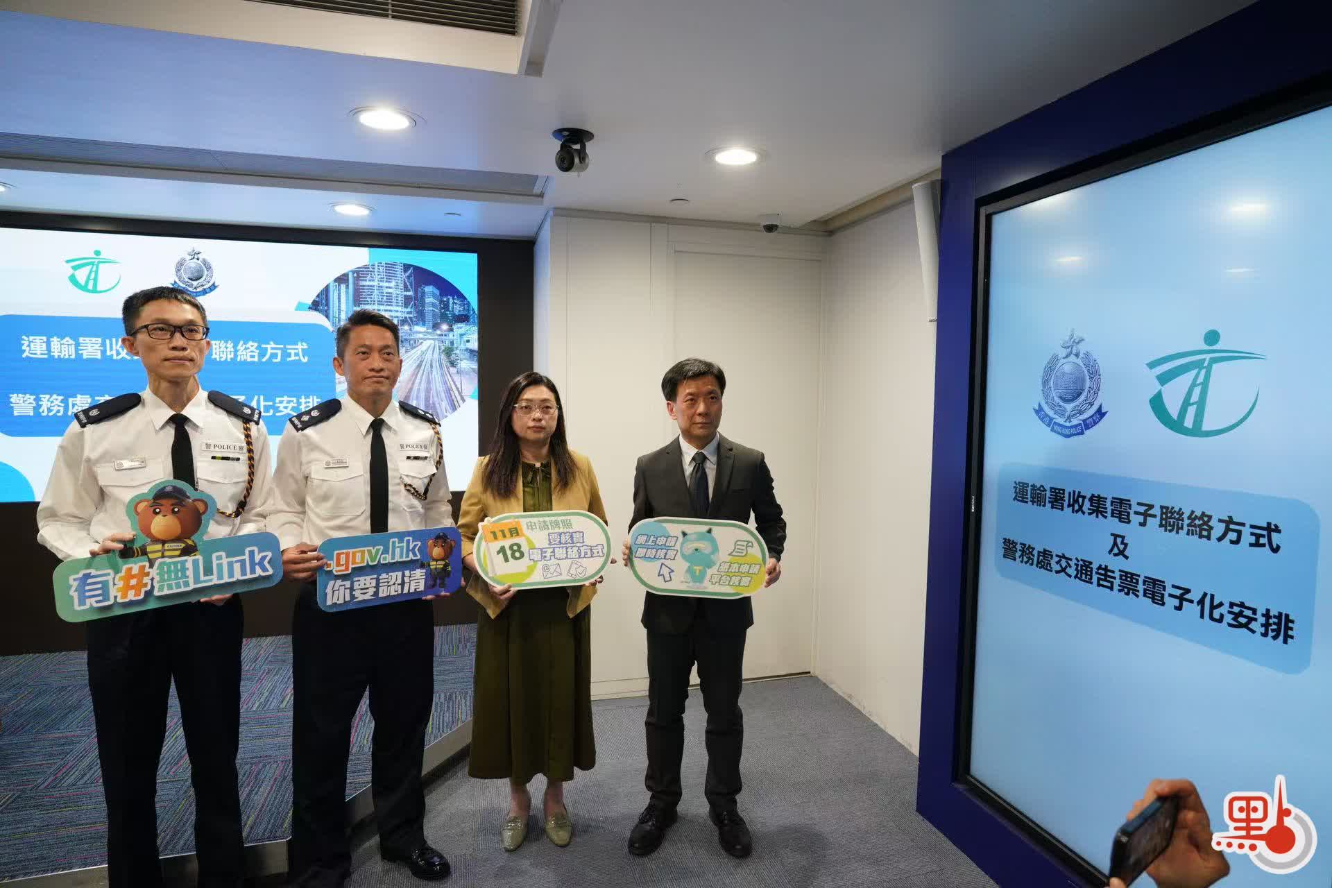 【點新聞報道】運輸署今日(11月1日)舉行聯合記者會,交代政府為配合吿票電子化,向駕駛執照及車輛牌照申請人收集電子聯絡方式的相關安排。由今年11月18日起,市民通過「網上申請 即時核實」以及「紙本申請 平台核實」兩種方式,新申請駕駛執照和車輛牌照等21項牌照或續牌時,需要提供和核實香港流動電話號碼或電郵地址,作為電子聯絡方式,以在未來接收香港警務處和運輸署的電子訊息,為明年上半年逐步推行電子交通執法做好準備。