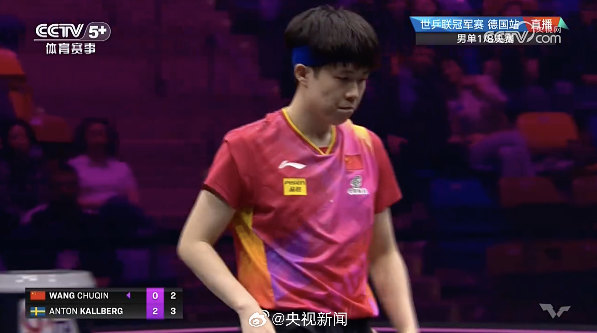 第一局,王楚欽在追到6-7時連丟3分,最終以8-10丟掉首局;第二局,王楚欽開局1-5落後,以5-11再丟一局。第三局,王楚欽開局依然連續丟分,在2-5落後時選擇叫暫停。暫停回來後,王楚欽在3-9落後時連追兩分,但還是以6-11輸掉第三局,總比分0-3不敵卡爾伯格,止步法蘭克福冠軍賽男單16強。