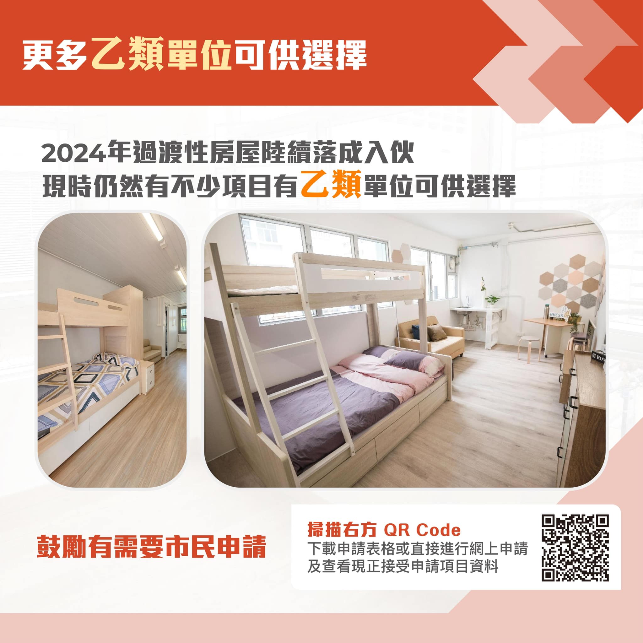 她提到,一眾營運機構都認同有關安排,現時已有12個項目調整了甲乙類比例,9個調整為50︰50,另有3個調整為60︰40。在現有約17,900個過渡性房屋單位中,可供乙類租用的單位超過6,500個。當中鄰近紅磡港鐵站的「善匯」、大埔的「樂善村」及「善樓」、元朗的「路德會雙魚薈」、「路德會七星薈」及「新田部屋」,及打鼓嶺的「博愛昇平村」,還有一定數量的乙類單位,歡迎有需要的合資格市民申請。