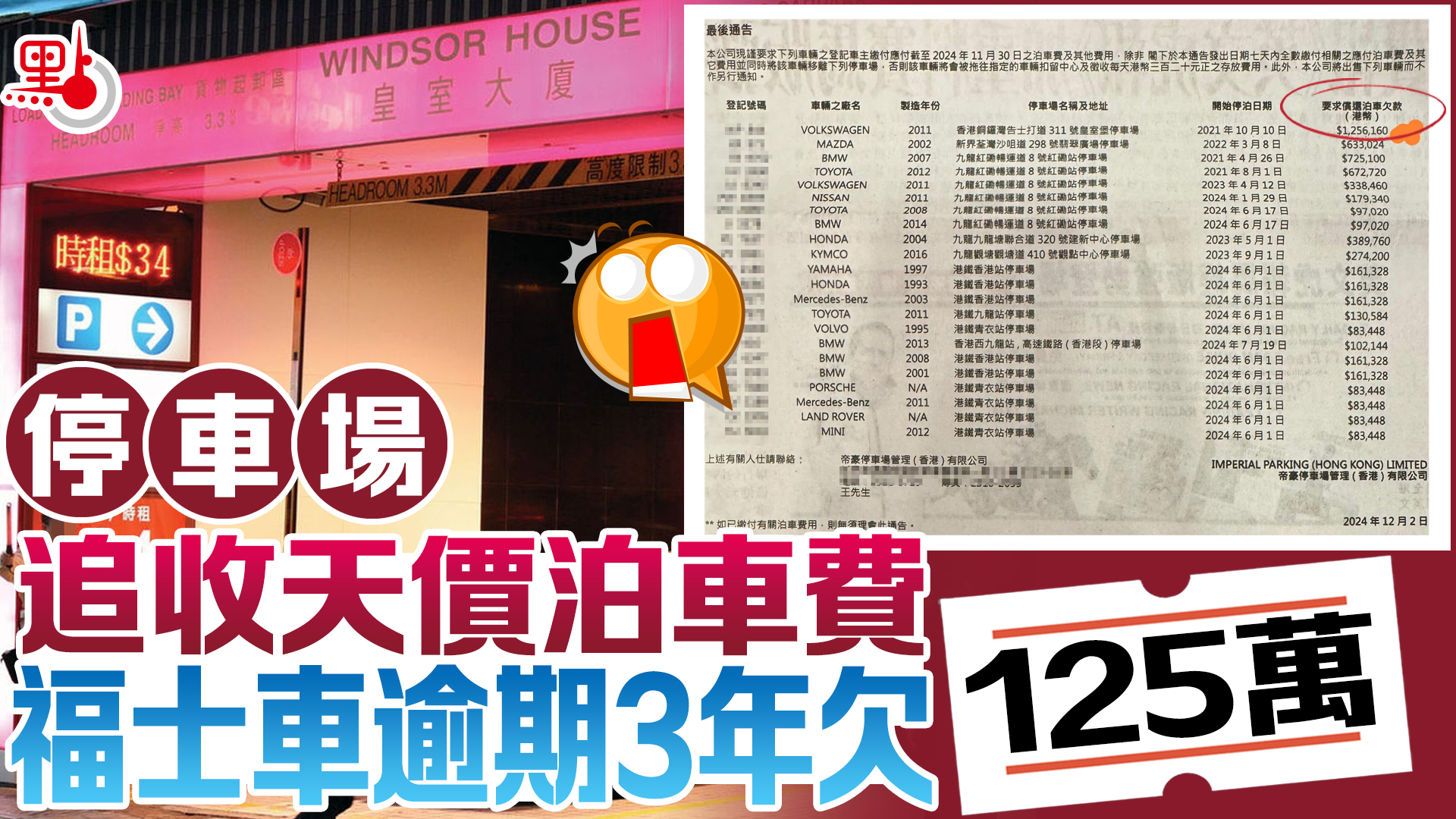 【點新聞報道】有連鎖停車場管理公司日前於報章刊登追討停車費通告,通告公開向22部車輛追收欠款,其中一部福士車輛停泊在銅鑼灣皇室堡接近3年2個月,被追收泊車款項超過125萬元,另有車主被追收60萬元至70萬元。