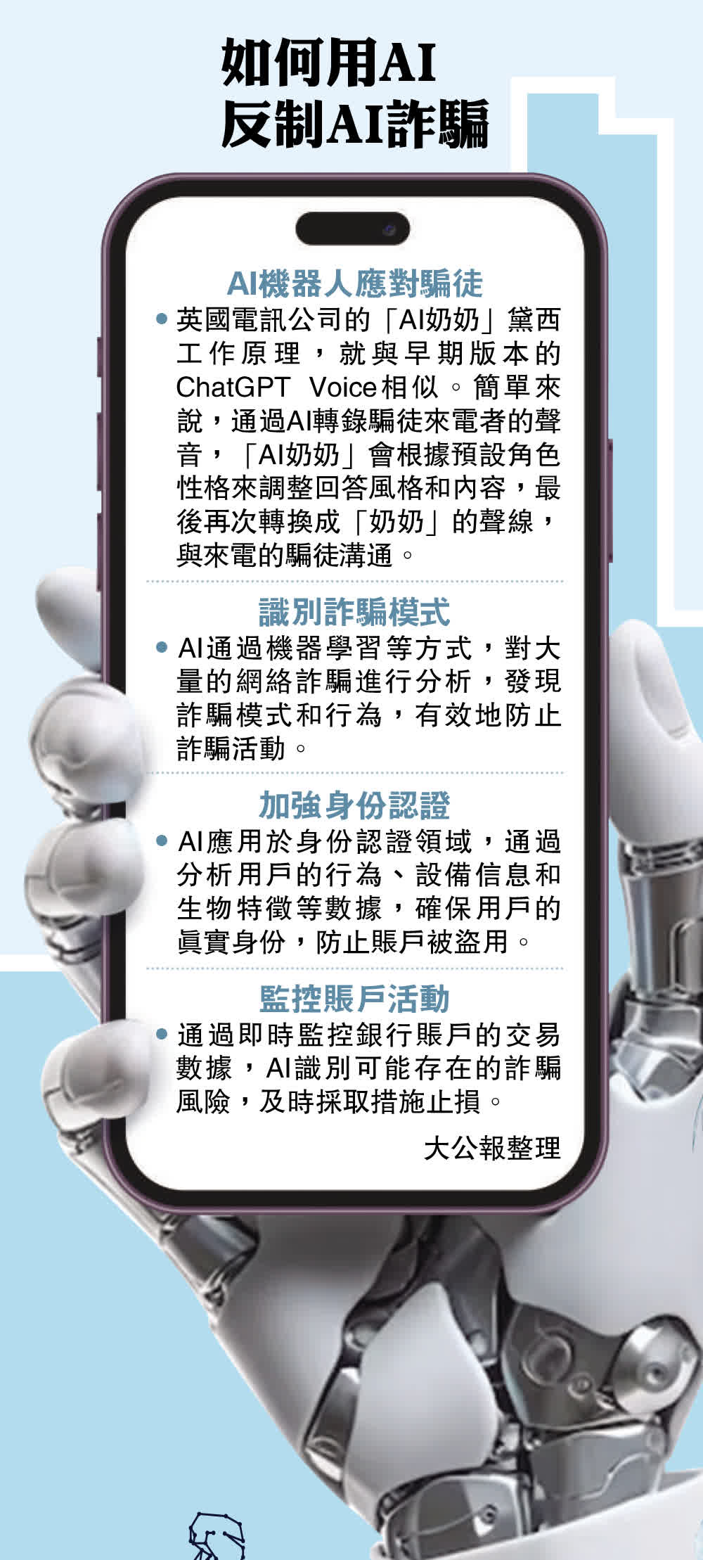 大公報綜合《紐約時報》、CBS報道,網絡詐騙手法層出不窮,一年可能讓全球損失超過一萬億美元(約7.8萬億港元)。隨着人工智能(AI)技術發展,犯罪分子可進行「換臉」、克隆聲音等多種方式,製作逼真的合成視頻或音頻實施新型網絡詐騙,包括進行「殺豬盤」的網絡愛情騙局,讓人防不勝防。不過,AI技術也是雙刃劍,有英國電信公司近期推出一款聊天機器人,專門跟網絡騙徒對話,以子之矛,攻子之盾。所謂道高一尺魔高一丈,這恰好說明了AI技術可以成為打擊詐騙的工具,未來可能有助遏制詐騙。對於普通人來講,能夠做到的就是提高警惕,勿輕信網絡,輕易交心。