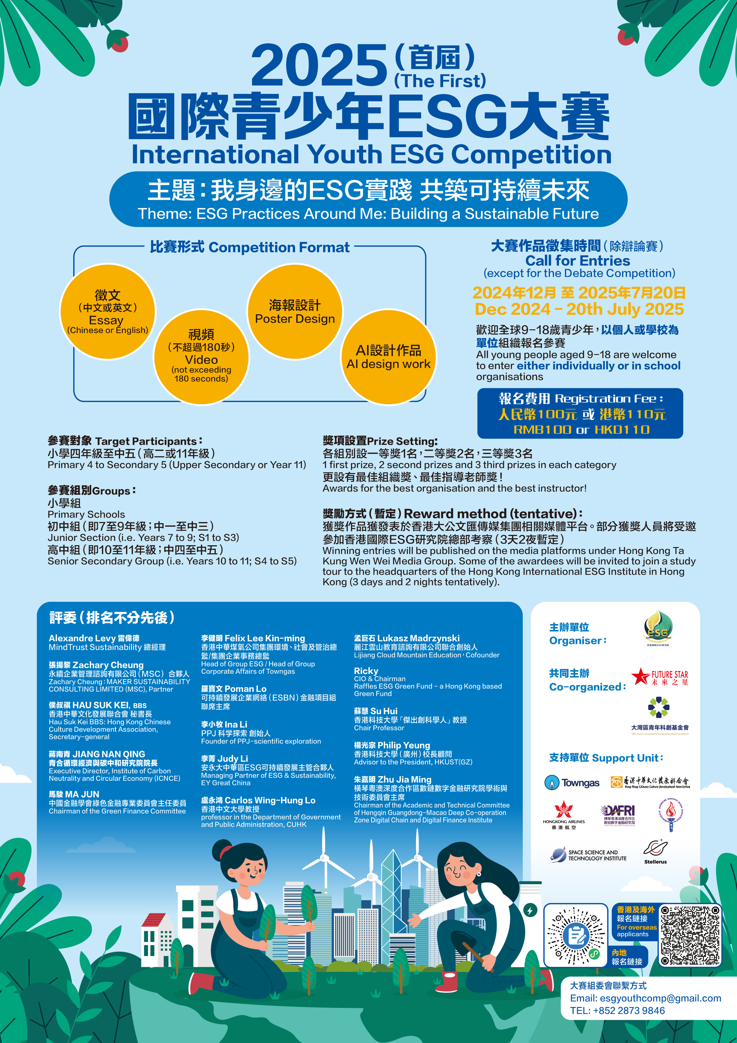 現在,機會來了!由香港國際ESG研究院主辦的2025(首屆)國際青少年ESG大賽正式啟動啦!這是一場面向全球6至18歲青少年的創意與實踐的盛會。大賽以「我身邊的ESG實踐:共築可持續未來」為主題,期待你用細膩真摯的觀察、獨具慧眼的巧思、靈感迸發的創意和腳踏實地的行動為地球和社會可持續發展的未來添上一抹亮色。