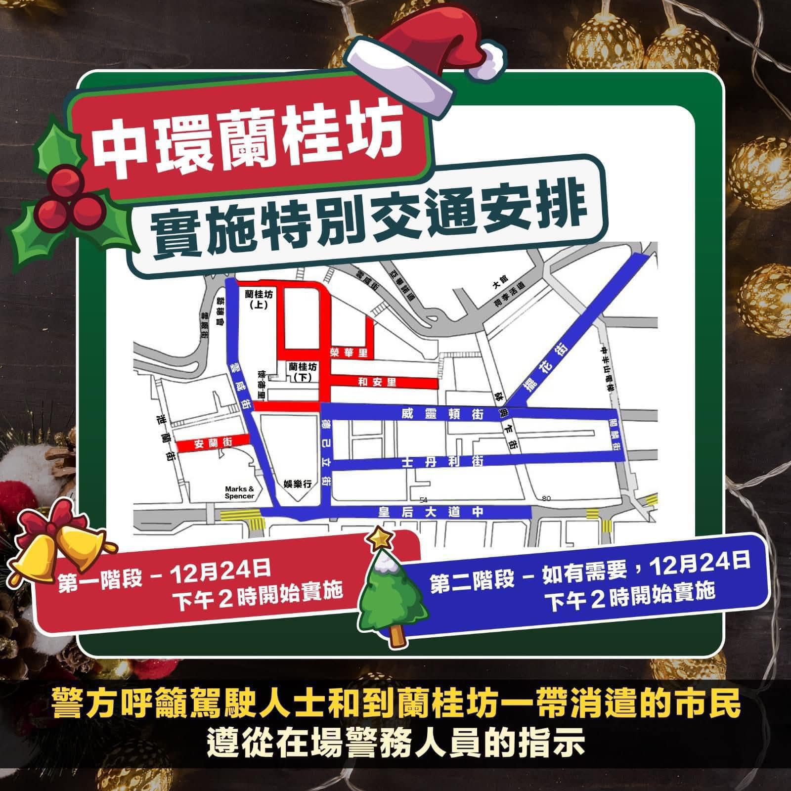 港島總區交通部執行及管制組總督察劉俊豪表示,蘭桂坊一帶會有封路措施,榮華里、和安里、介乎雲咸街與德己立街的威靈頓街等街道將於12月24日下午2時至12月25日上午5時封閉,其間威靈頓街的士站與士丹利街小巴站將會暫停使用。為配合封路安排,行經受影響地區的巴士及專線小巴路線會臨時改道或暫停服務。位於受影響地區的相關巴士站及專線小巴站,亦需暫停使用或遷移。