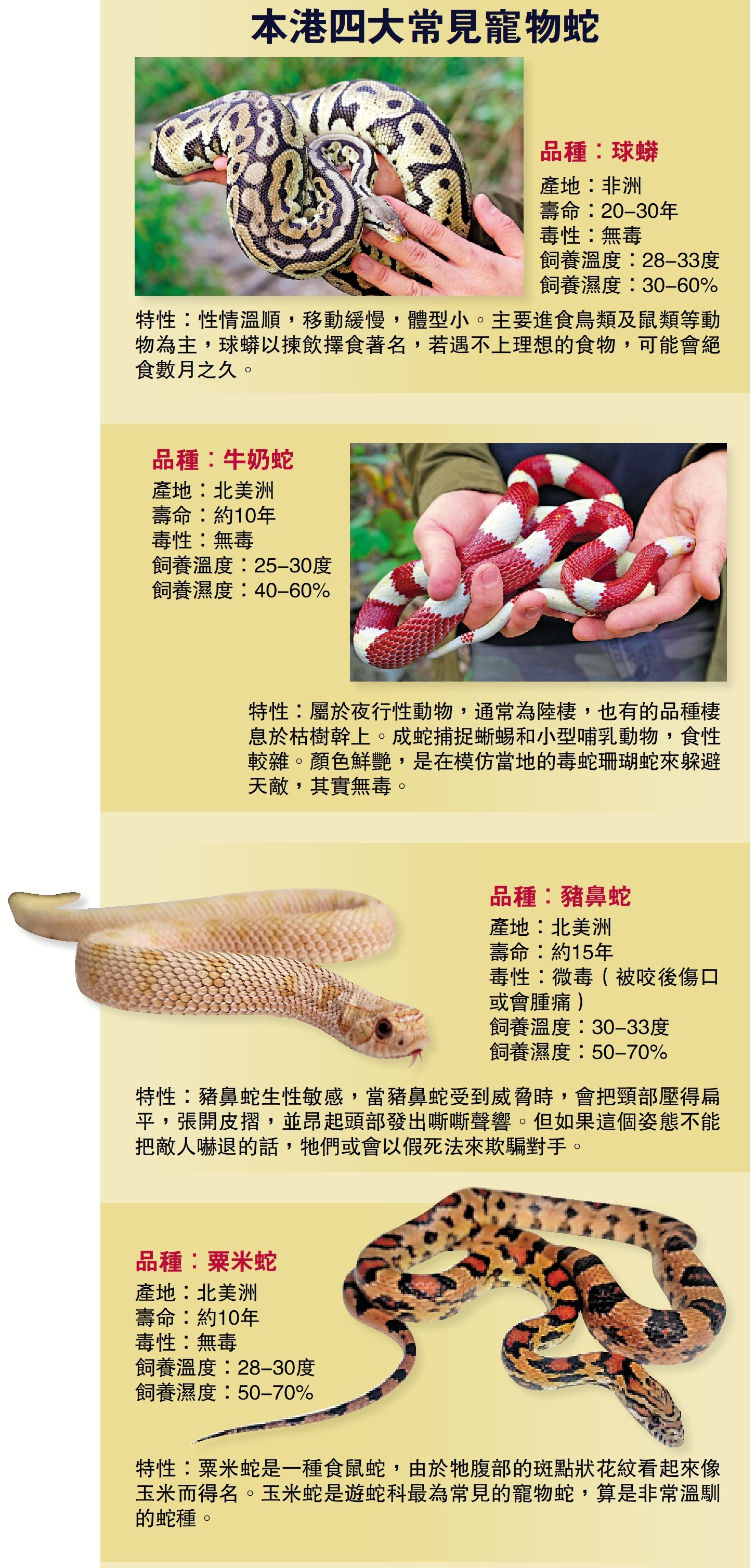 「隨着全球暖化,冬季蛇出沒的求助數字確實多了不少,但當中有超過10%在民居捉到的蛇其實是寵物蛇,最常見的是球蟒。」警方認證的捉蛇專家李逸朗(Ivan)表示,球蟒來自非洲,因體型較小,且經培育後顏色多,加上性格溫順,因此成了香港熱門的寵物。此外,香港還有不少其他品種的寵物蛇。