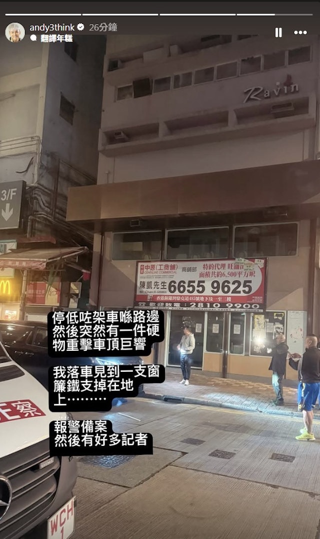 鄺旨呈表示,當時將車泊在上址,正考慮是否下車到快餐店用膳,突然聽到車頂傳出巨響;落車查看發現車頂微凹損毀,地面遺下鋁枝。事後鄺將車駕走,並在社交平台交代事件。