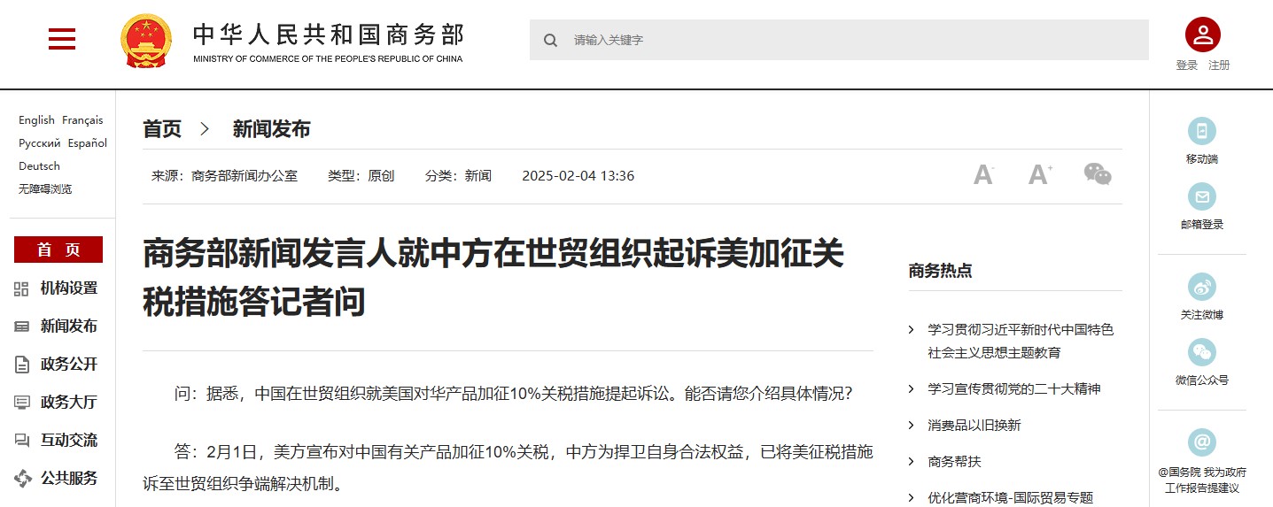發言人表示,2月1日,美方宣布對中國有關產品加徵10%關稅,中方為捍衛自身合法權益,已將美徵稅措施訴至世貿組織爭端解決機制。