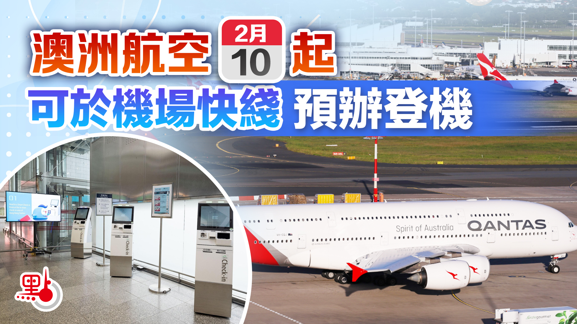 【點新聞報道】港鐵公司今日(8日)表示,澳洲航空的乘客由2月10日(星期一)起,可於服務時間內,在香港站及九龍站預辦登機手續及託運行李,服務適用於航班預定起飛前24小時至最少90分鐘。