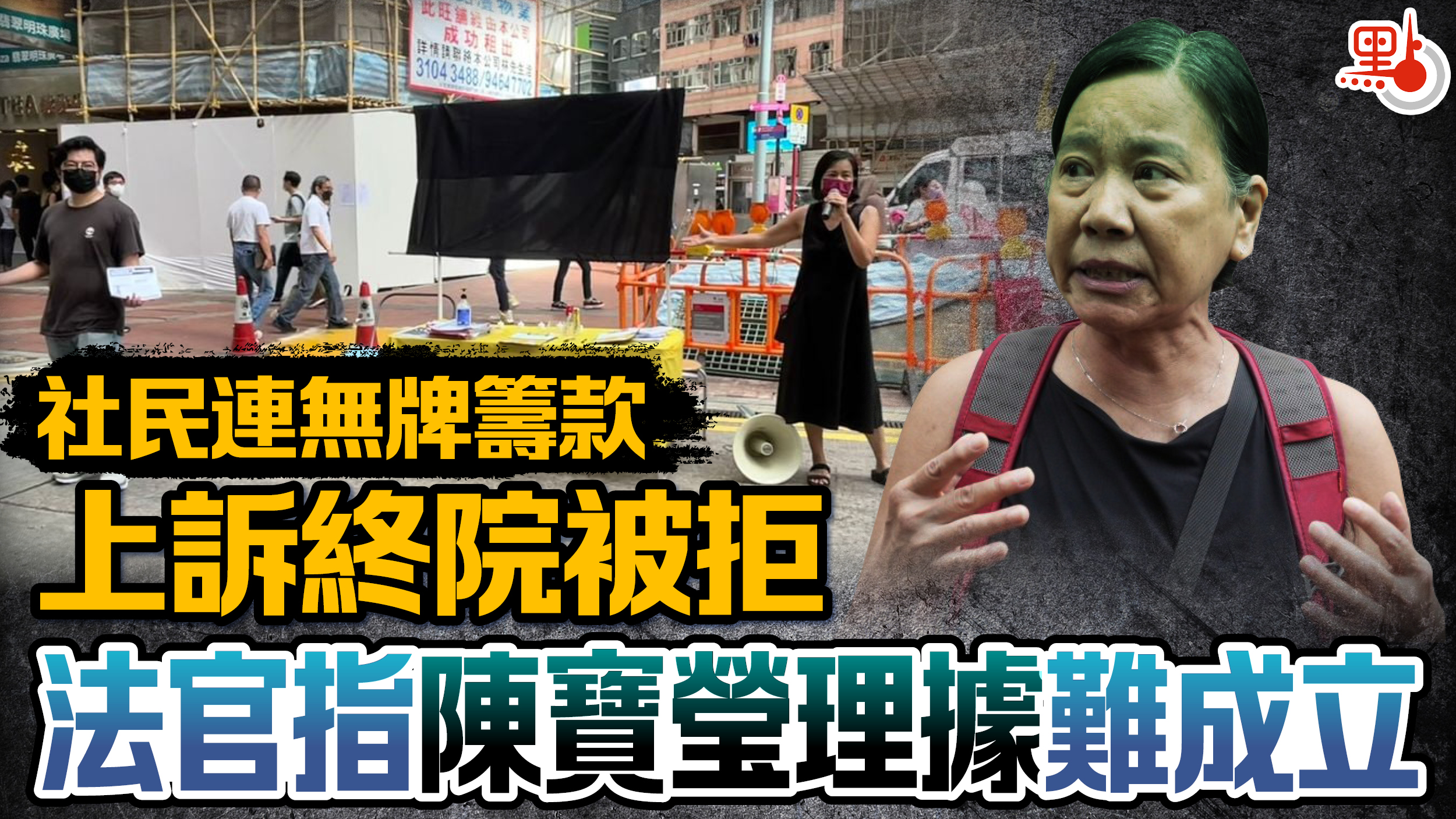 【點新聞報道】社民連頭目陳寶瑩2021年在旺角東天橋擺街站,在易拉架海報上展示網上平台Patreon的二維碼,被裁定沒有許可證而在公眾地方籌款的傳票控罪罪成,判罰1000元。她不服定罪,提出上訴較早前被駁回,再申請上訴至終院,高院原訟庭昨日拒絕批出上訴證明書。