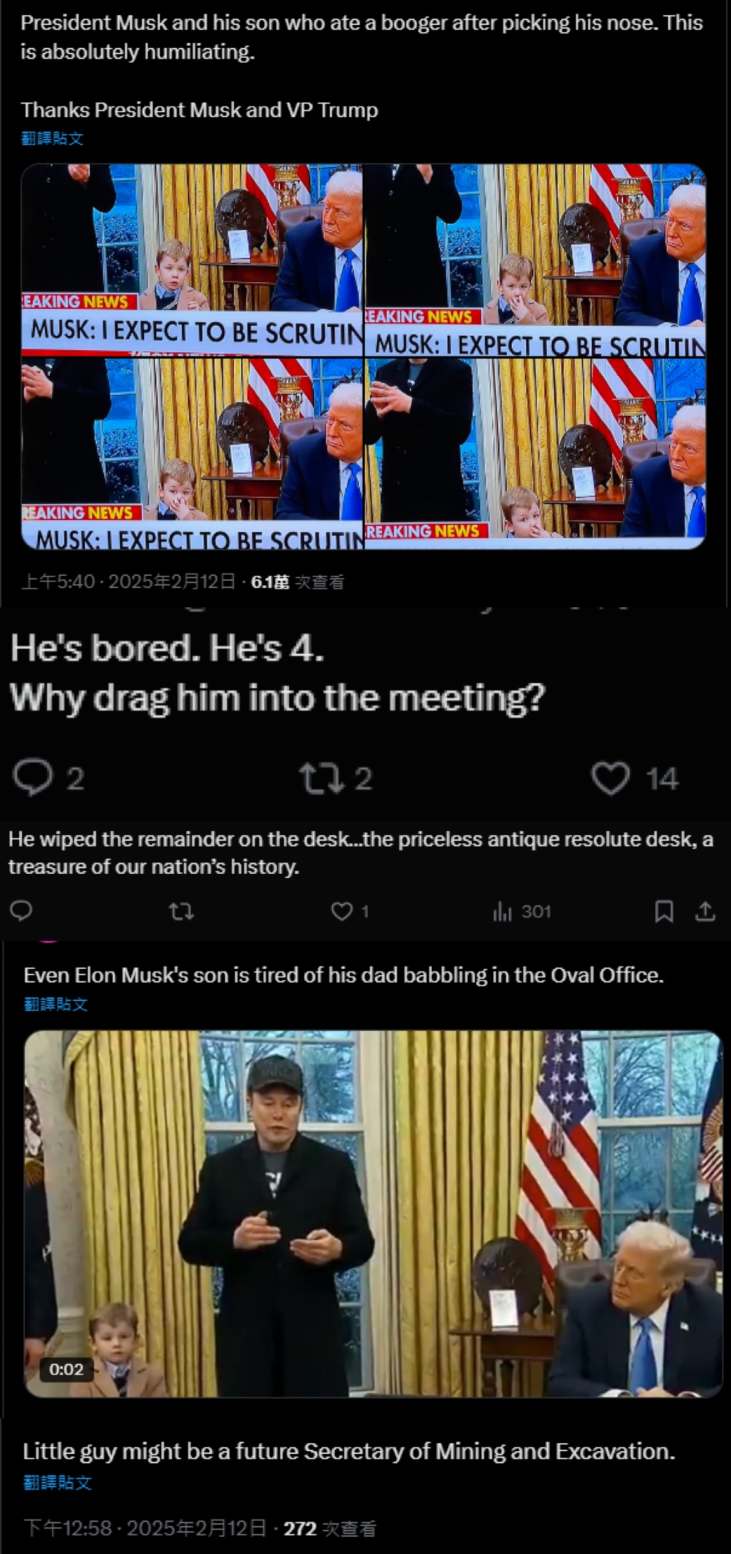 然而,X之後的一個舉動讓很多美國網友笑不出來了。在場的許多媒體都拍到,X站在特朗普身旁,就靠在橢圓形辦公室的辦公桌邊,開始撩鼻屎!這一行為引起不少網友熱議。有美國網友認為,這一行為十分丟臉,更說道:「感謝馬斯克總統和特朗普副總統(Thanks President Musk and VP Trump)。」似乎是在嘲諷馬斯克與其兒子的行為。還有網友指責X把鼻屎擦在了辦公桌上,並指出這張辦公桌是「美國歷史的珍寶(a treasure of nation's history)」。
