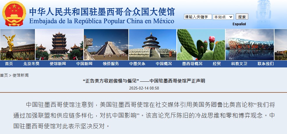 【點新聞報道】據中國駐墨西哥使館網站今日(14日)消息,中國駐墨西哥使館注意到,美國駐墨西哥使館在社交媒體引用美國務卿魯比奧言論稱「我們將通過加強聯盟和供應鏈多樣化,對抗中國影響」。該言論充斥陳舊的冷戰思維和零和博弈觀念。中國駐墨西哥使館對此表示堅決反對。