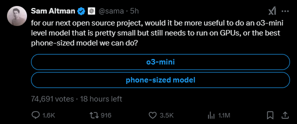 【點新聞報道】當地時間2月17日,美國開放人工智能研究中心(OpenAI)首席執行官薩姆·奧爾特曼(Sam Altman)在社交平台上就該公司下一個開源項目發起投票調查。