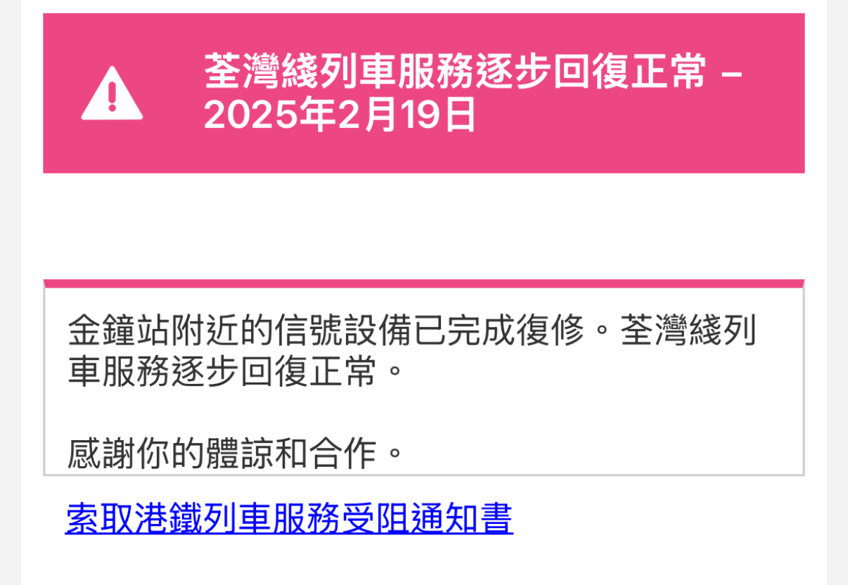港鐵今日稍早曾表示,由於金鐘站出現信號設備故障,荃灣綫列車預計需要10至15分鐘額外行車時間,呼籲乘客為行程預留充裕時間。