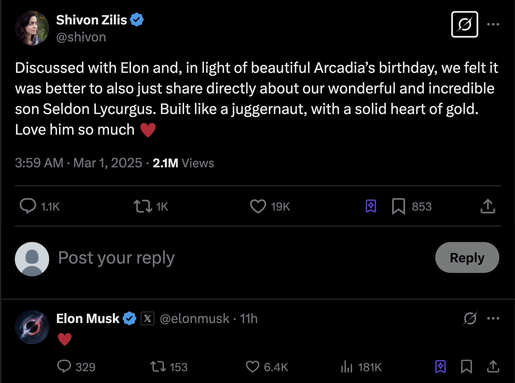 【點新聞報道】全球科技巨頭創始人埃隆·馬斯克的家庭規模再度擴大。當地時間2月28日,其旗下腦機接口公司Neuralink高管希馮·齊利斯(Shivon Zilis)在社交媒體平台X宣布,她與馬斯克迎來了兩人的第四個孩子──兒子瑟爾頓·萊克古斯(Seldon Lycurgus)。馬斯克在帖文下以愛心符號回應,確認了這一消息。