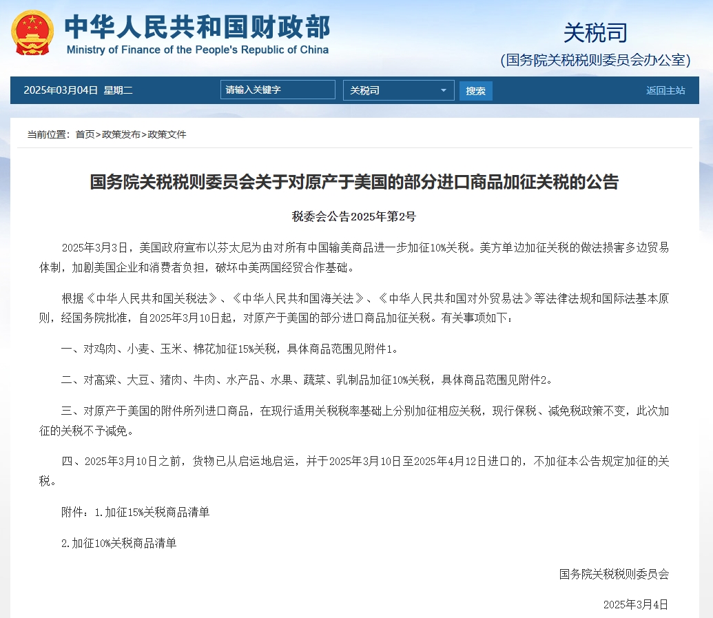 為維護國家利益和國際法基本原則,根據《中華人民共和國關稅法》、《中華人民共和國海關法》、《中華人民共和國對外貿易法》等相關法律法規,並經國務院批准,中國政府決定自2025年3月10日起,對原產於美國的部分進口商品加徵關稅。具體措施如下: