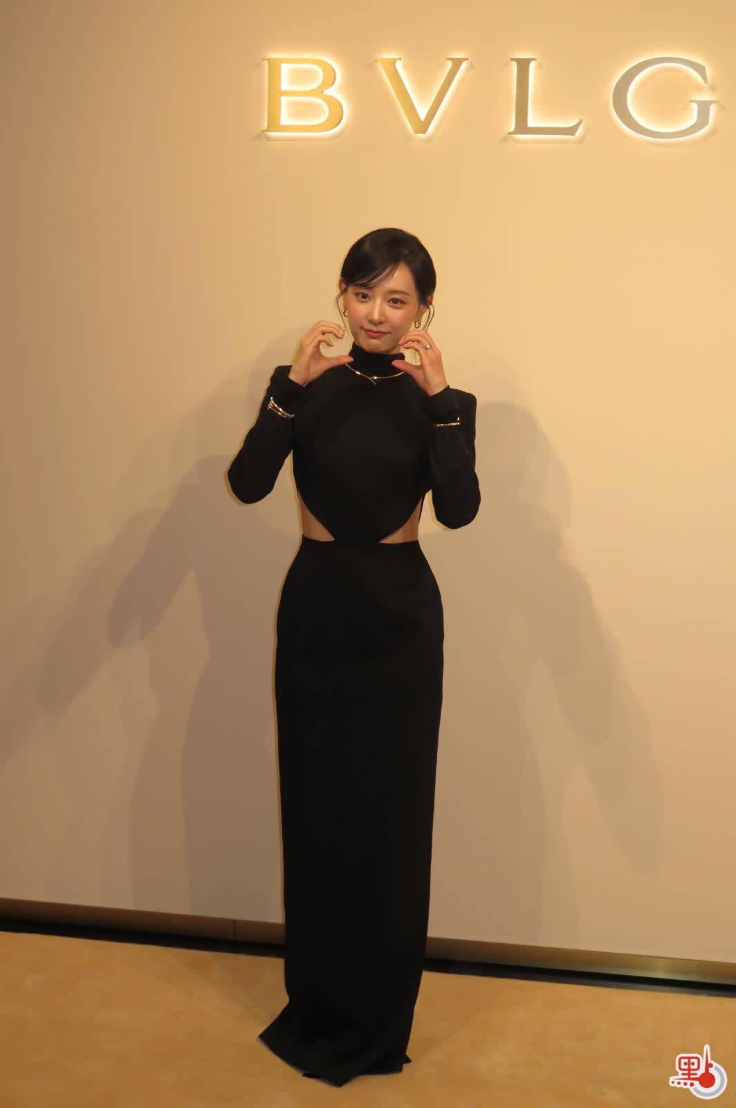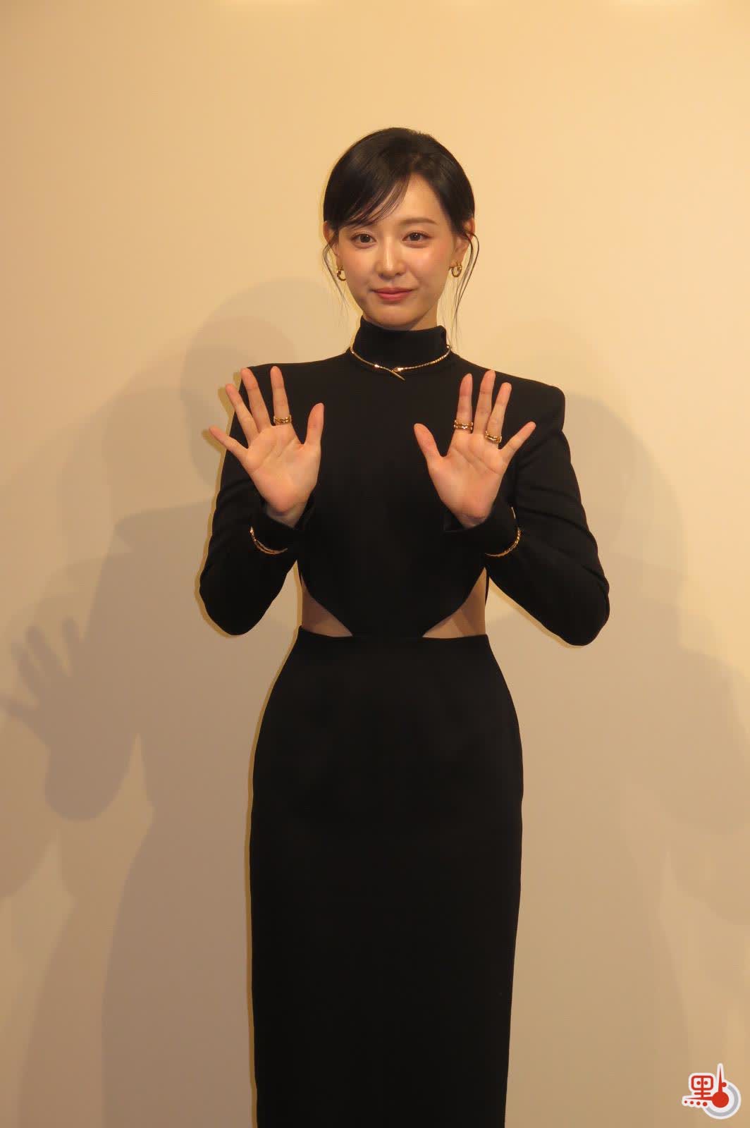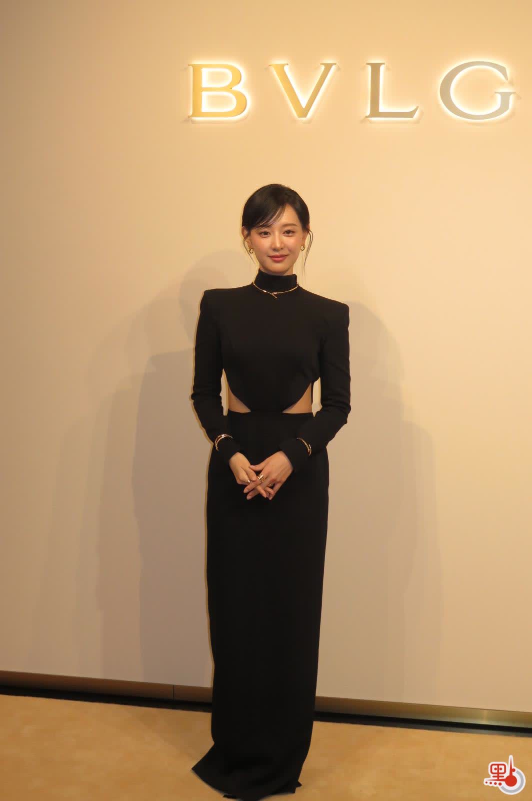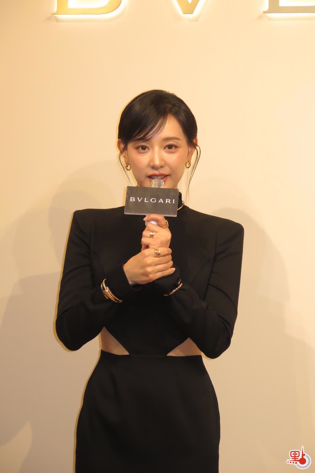 身穿黑色長裙露背長裙的金智媛,盡顯優雅與高貴。她表示因品牌而來港感到高與,之後再分享穿載飾物心得。