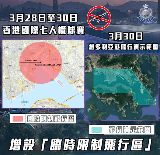 另外,警方及民航處提醒市民,為紀念由啟德啟航的香港百年航空歷史,主辦機構於周日(3月30日)會進行飛越維多利亞港的飛行演示。民航處將在維多利亞港原有限制飛行區一帶再增設臨時限制飛行區,限制放飛無人機 (即航拍機或模型飛機等)的飛行活動。