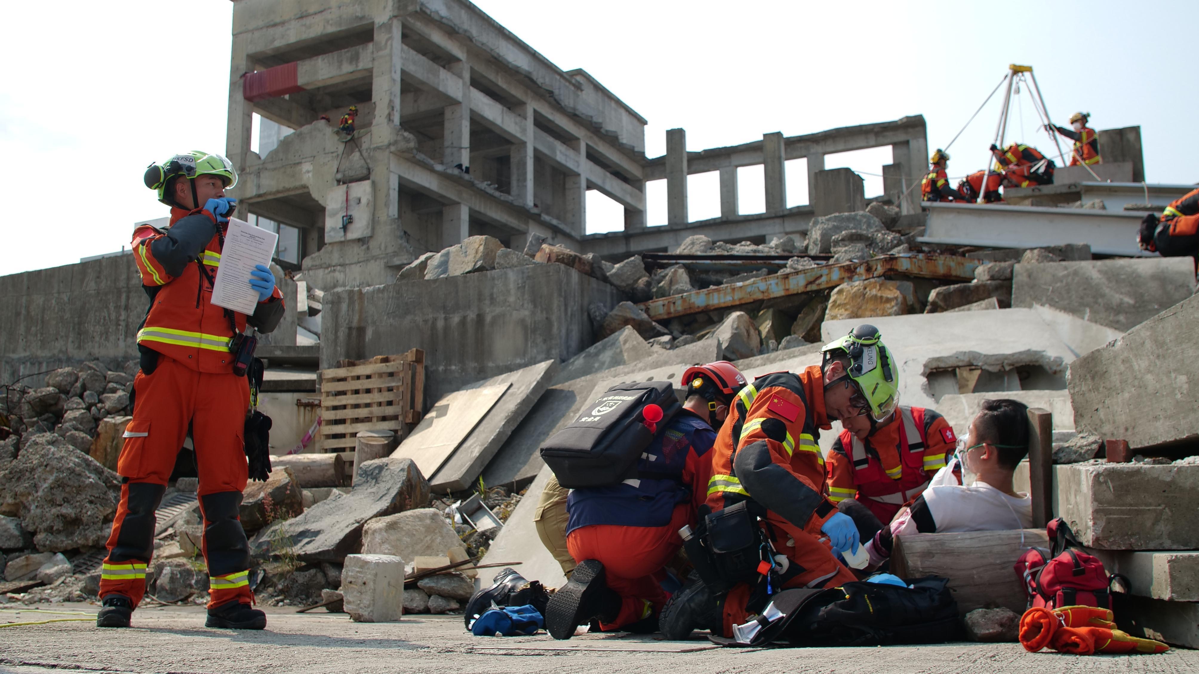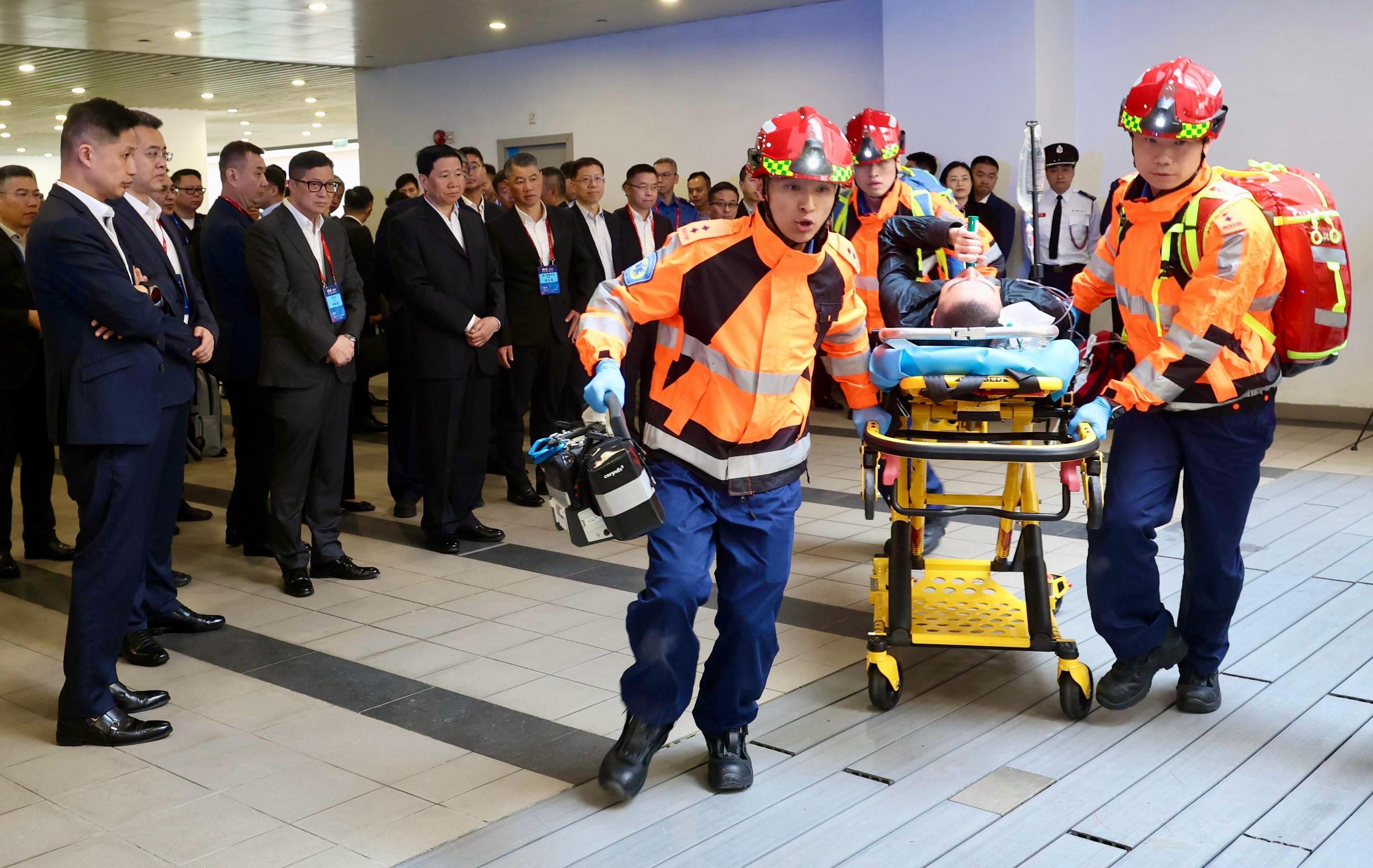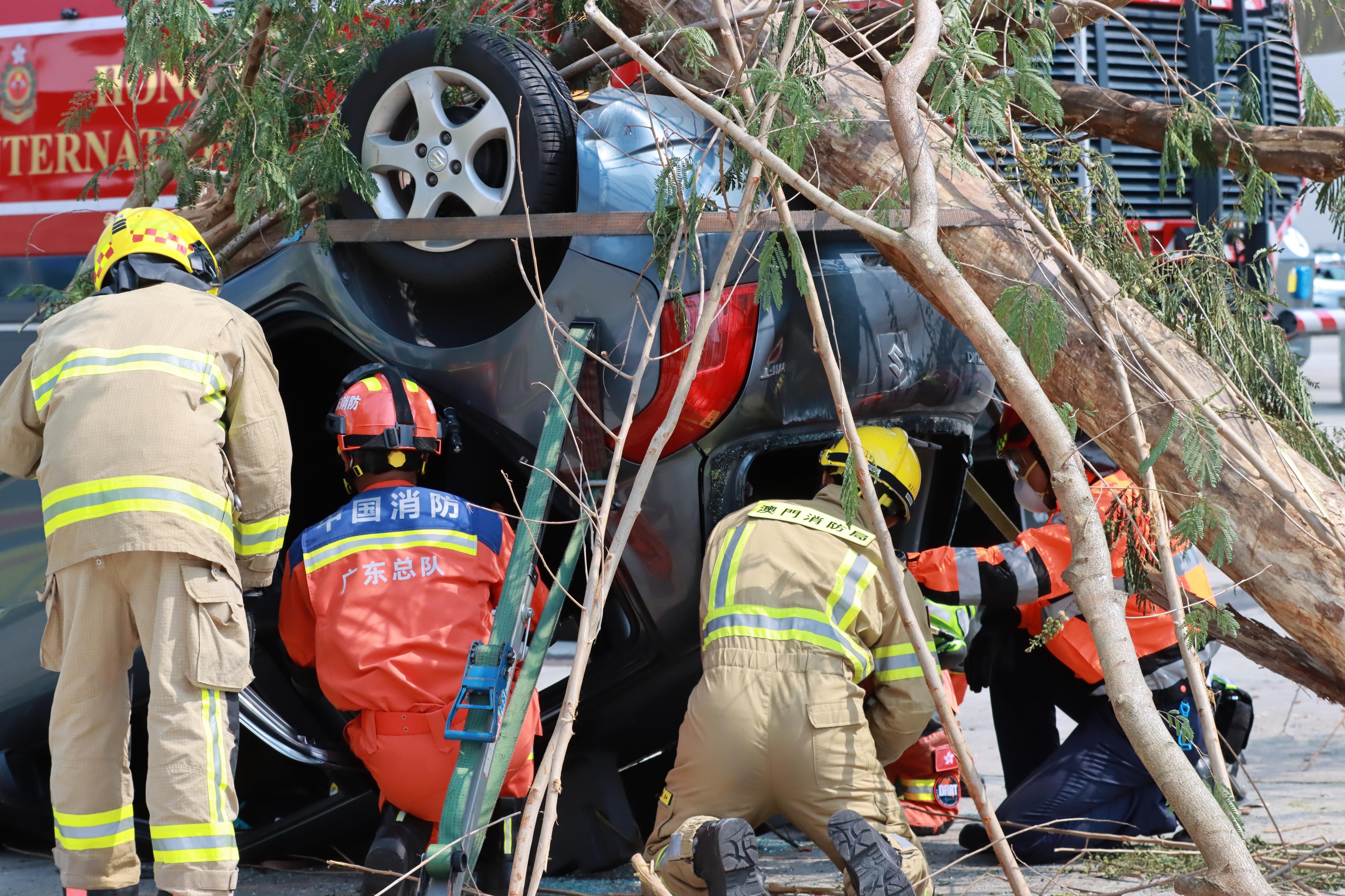 廣東省消防救援總隊迅速派出60名隊員及13輛消防車,攜帶超過900件救援裝備;澳門消防局亦調遣15名隊員、五輛消防車及超過300件救援設備到香港支援。兩地隊伍分別經由深圳灣口岸和港珠澳大橋香港口岸跨境綠色通道抵港參與演練。