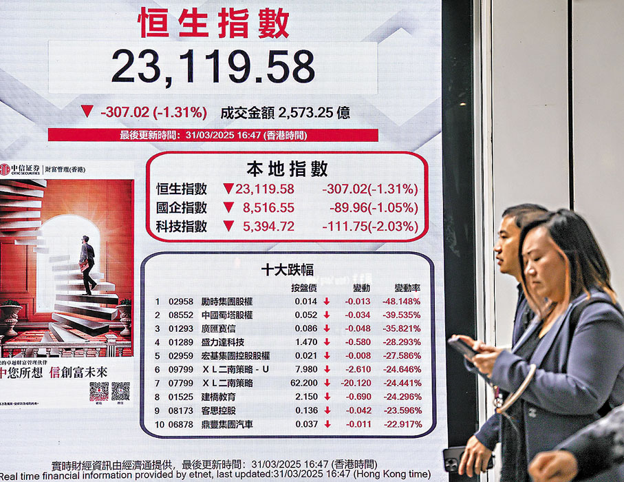 華富建業證券投資策略聯席總監阮子曦說,港股首季表現突出,但本周情勢風高浪急,主要因4月2日美國將實施其「對等關稅」計劃,令市場胃納及想法都呈較負面的方向。亞太區主要股市下挫,日股更創去年9月以來的最大單日跌幅,連台股也跌逾4%,見逾7個月低位。他認為,恒指一旦失守23,000點,預估下一個防守線將下移至50天線,即約22,400點附近。