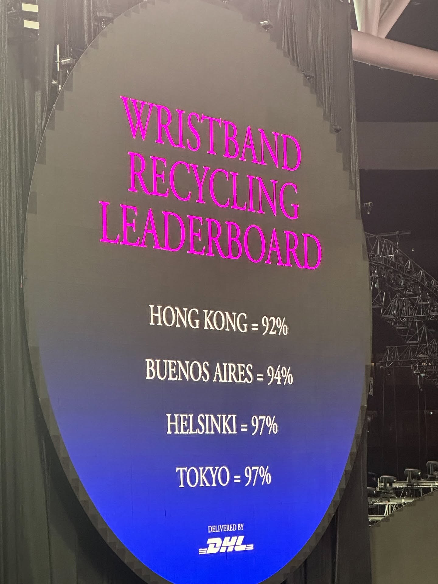 根據官方公布的「手環回收排行榜」,不同城市的觀眾在演出後歸還LED手環的比率都有所不同,反映各地粉絲對環保行動的支持程度和文化差異。排行榜顯示,日本東京及芬蘭赫爾辛基以97%的回收率位居榜首,其次是丹麥哥本哈根(96%)、阿根廷布宜諾斯艾利斯(94%)、瑞典哥德堡(94%),美國洛杉磯、德國柏林等地的回收率更低,只有80%,印尼雅加達更以77%墊底排包尾。