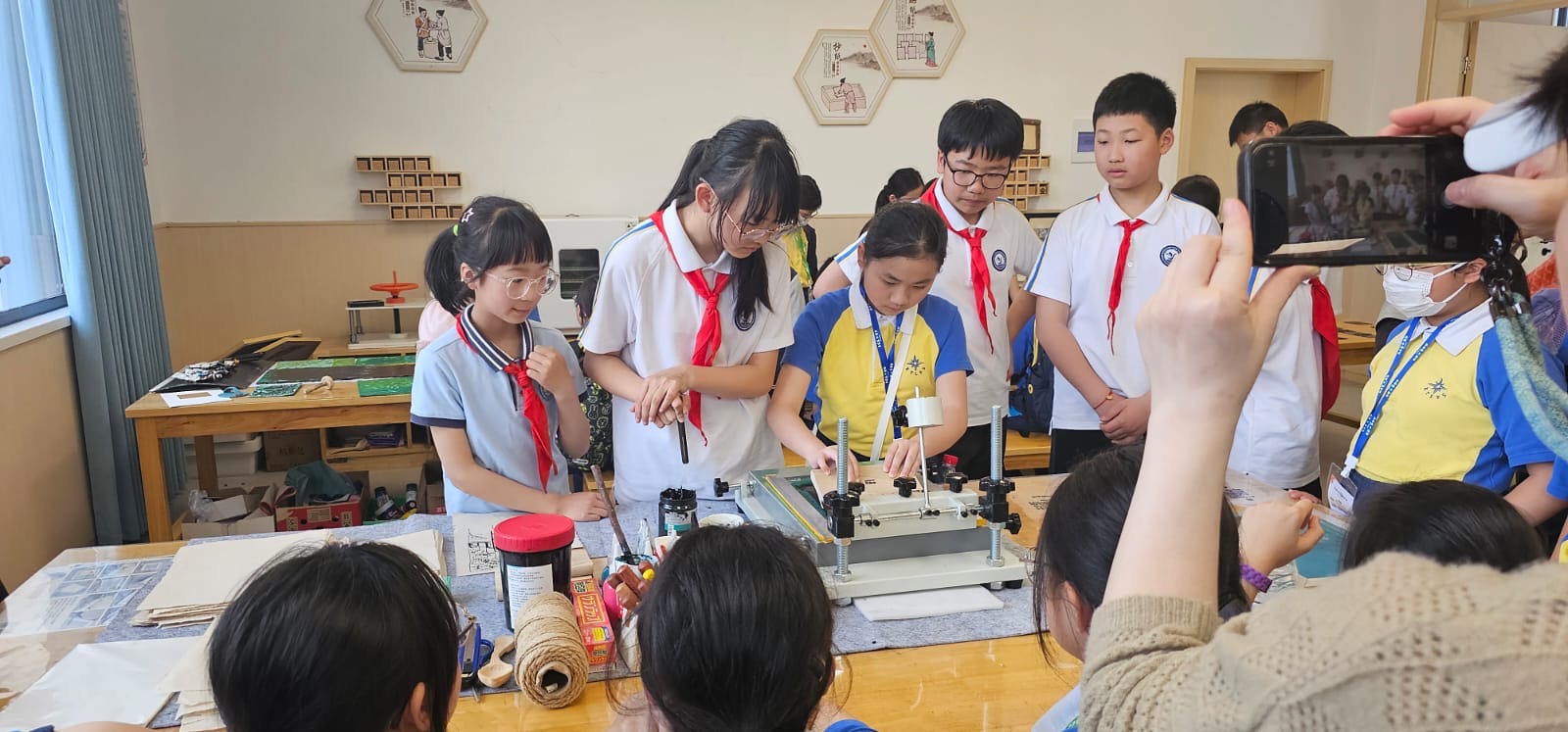 隨後,同學們來到了大源鎮中心小學的美術教室,開啟了一場別開生面的版畫製作交流之旅。活動現場,兩地的同學們分組進行絲網版畫、牛奶盒版畫以及膠板版畫的創作。同學們盡情探索,興奮地嘗試,心滿意足地展示自己的版畫作品,分享創作過程中的點滴心得。在這次活動中,同學們還收到一份特別的禮物——大源鎮中心小學蛇年校園日曆。這份日曆承載着師生的共同心血與美好祝願,見證了兩地師生珍貴的友誼,是兩地學校友好交流的印記和延續。